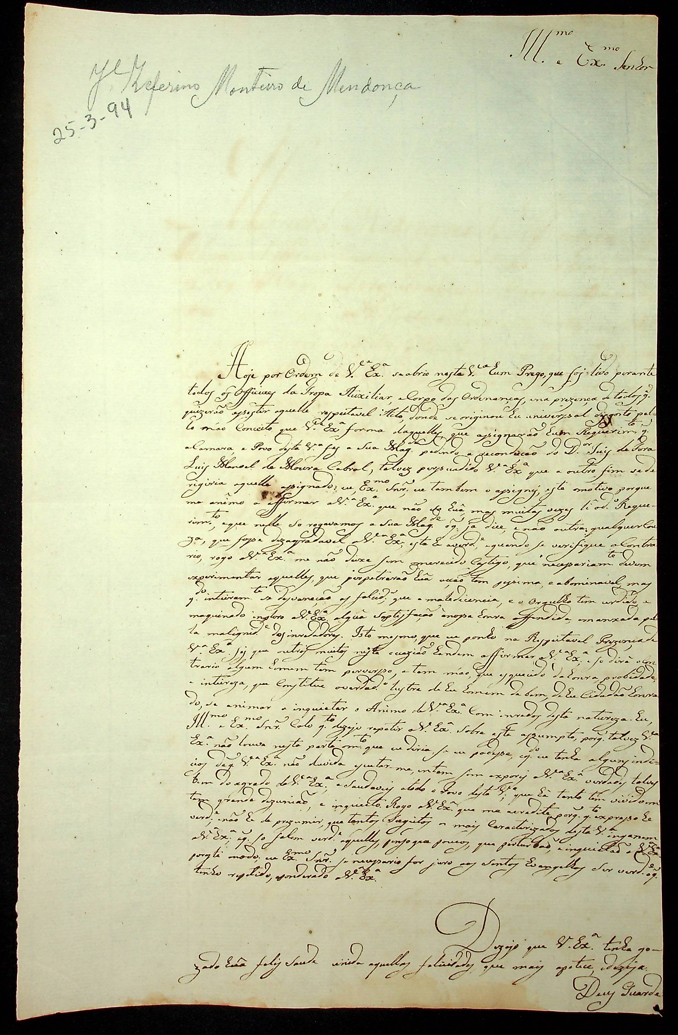 CARTA de José Zeferino Monteiro de Mendonça ao [Governador e Capitão-General da Capitania de Mato Grosso] João de Albuquerque de Melo Pereira e Cáceres.
