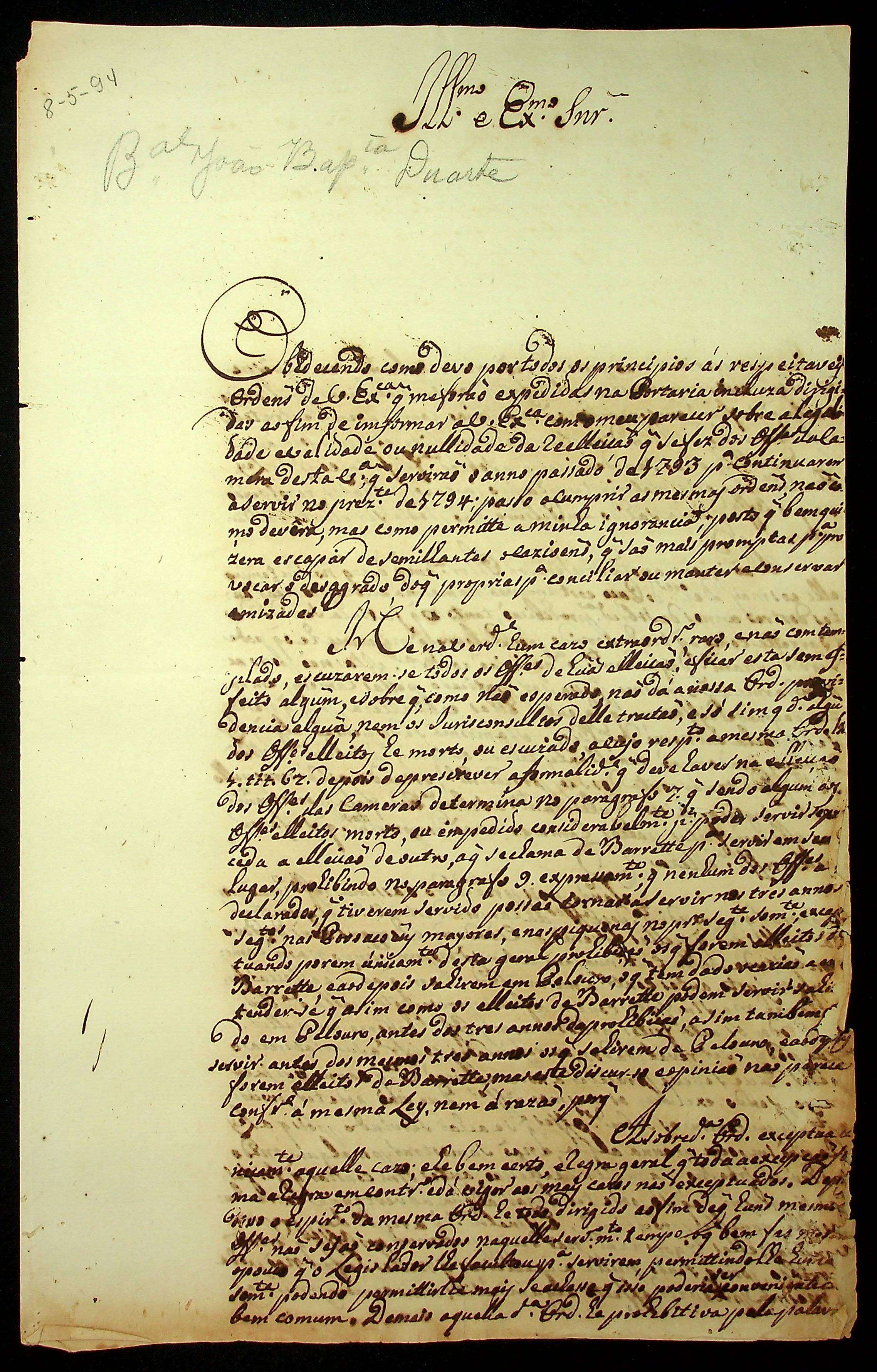 CARTA de João Baptista Duarte ao [Governador e Capitão-General da Capitania de Mato Grosso João de Albuquerque de Melo Pereira e Cáceres].