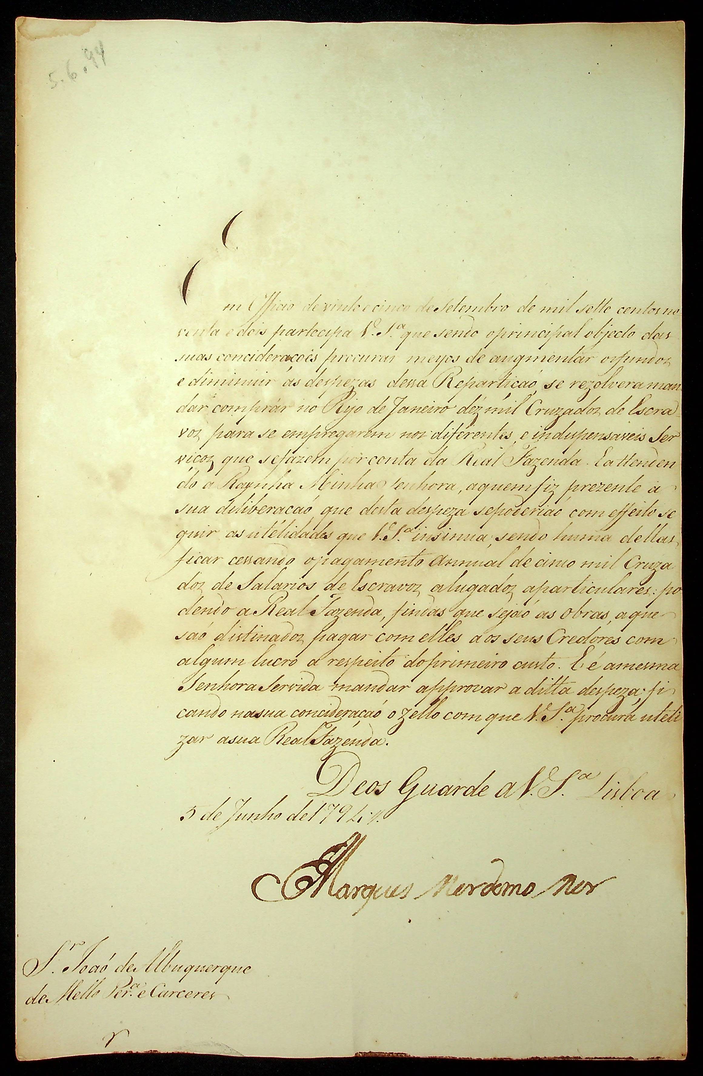 CARTA do Marquês Mordomo-mor ao Governador e Capitão-General da Capitania de Mato Grosso João de Albuquerque de Melo Pereira e Cáceres.