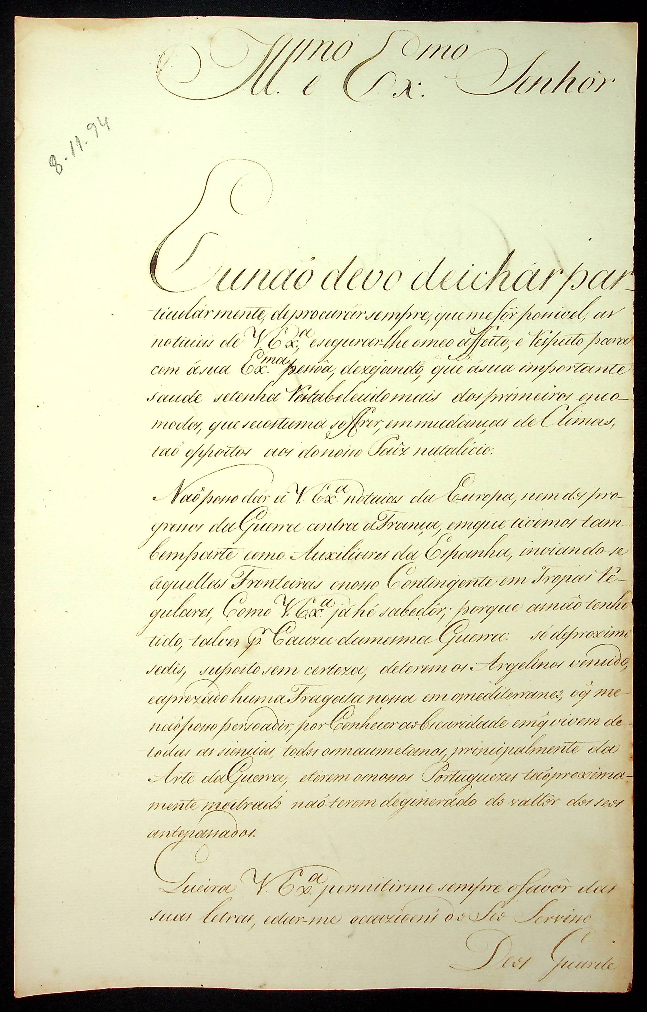 CARTA do [Governador e Capitão-General da Capitania de Goiás] Tristão da Cunha Meneses ao [Governador e Capitão-General da Capitania de Mato Grosso] João de Albuquerque de Melo Pereira e Cáceres.