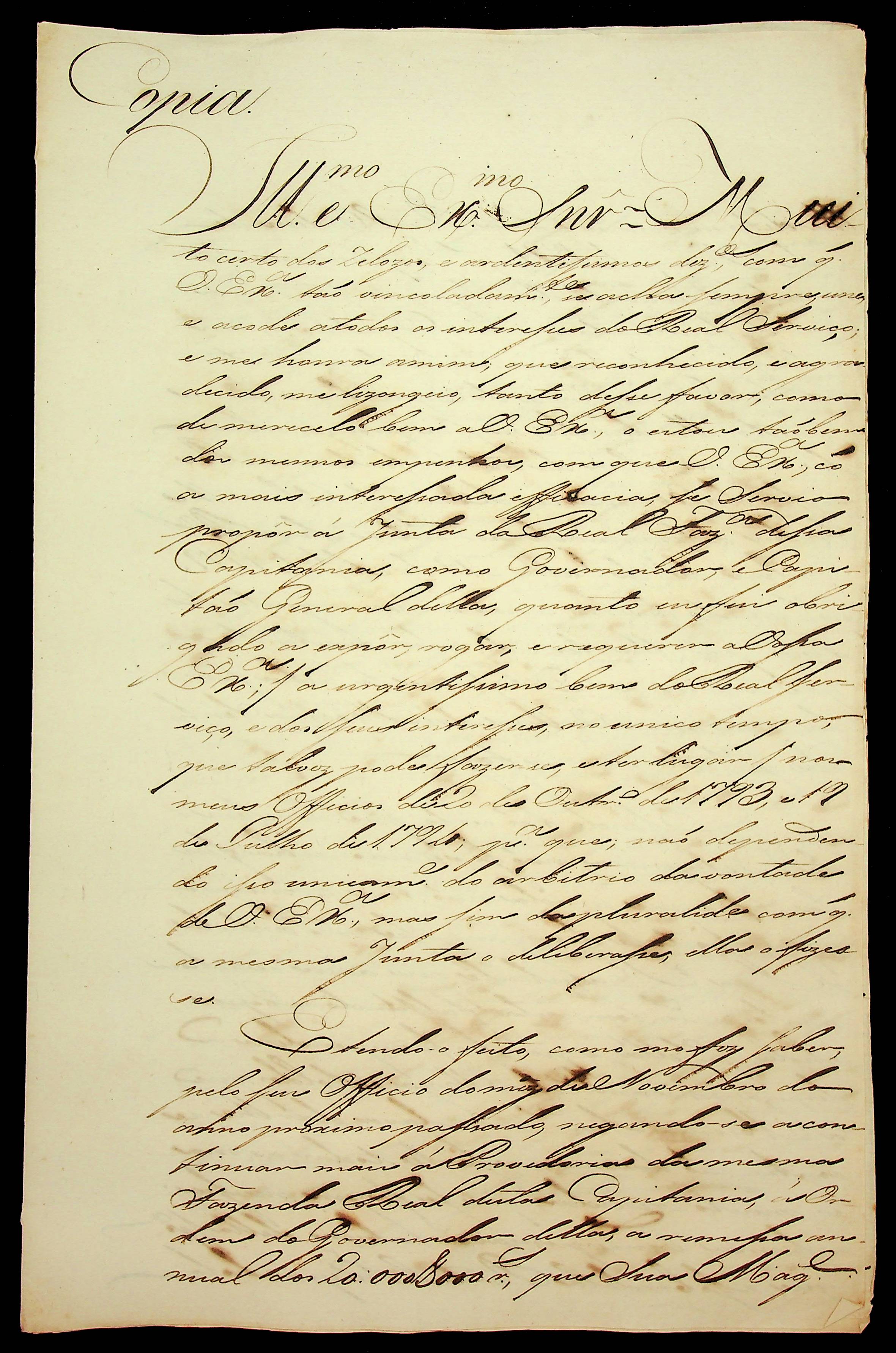 CARTA (cópia) do [Governador e Capitão General da Capitania de Mato Grosso] Grosso João de Albuquerque de Mello Pereira e Cáceres ao do [Governador e Capitão-General da Capitania de Goiás] Tristão da Cunha Menezes.