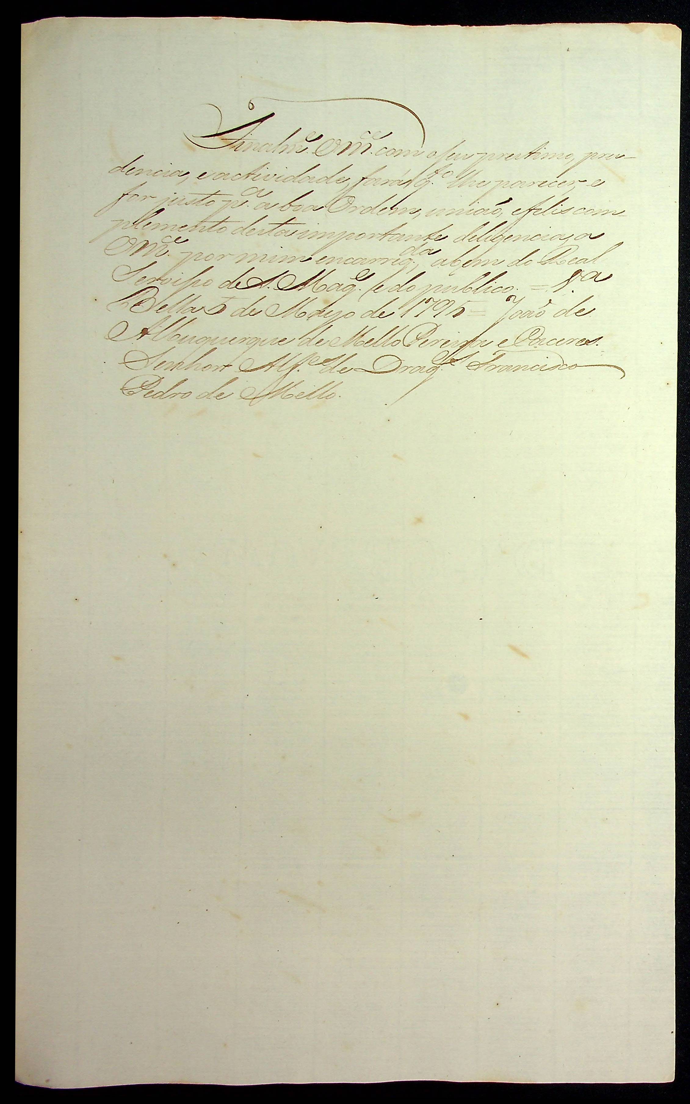 CARTA de Ordem do Governador e Capitão-General João de Albuquerque de Melo Pereira e Cáceres para o Alferes de dragões Francisco Pedro de Melo em que lhe encarrega o comando da Bandeira com que foi expedido destas vilas, com a mais que na mesma se contém.