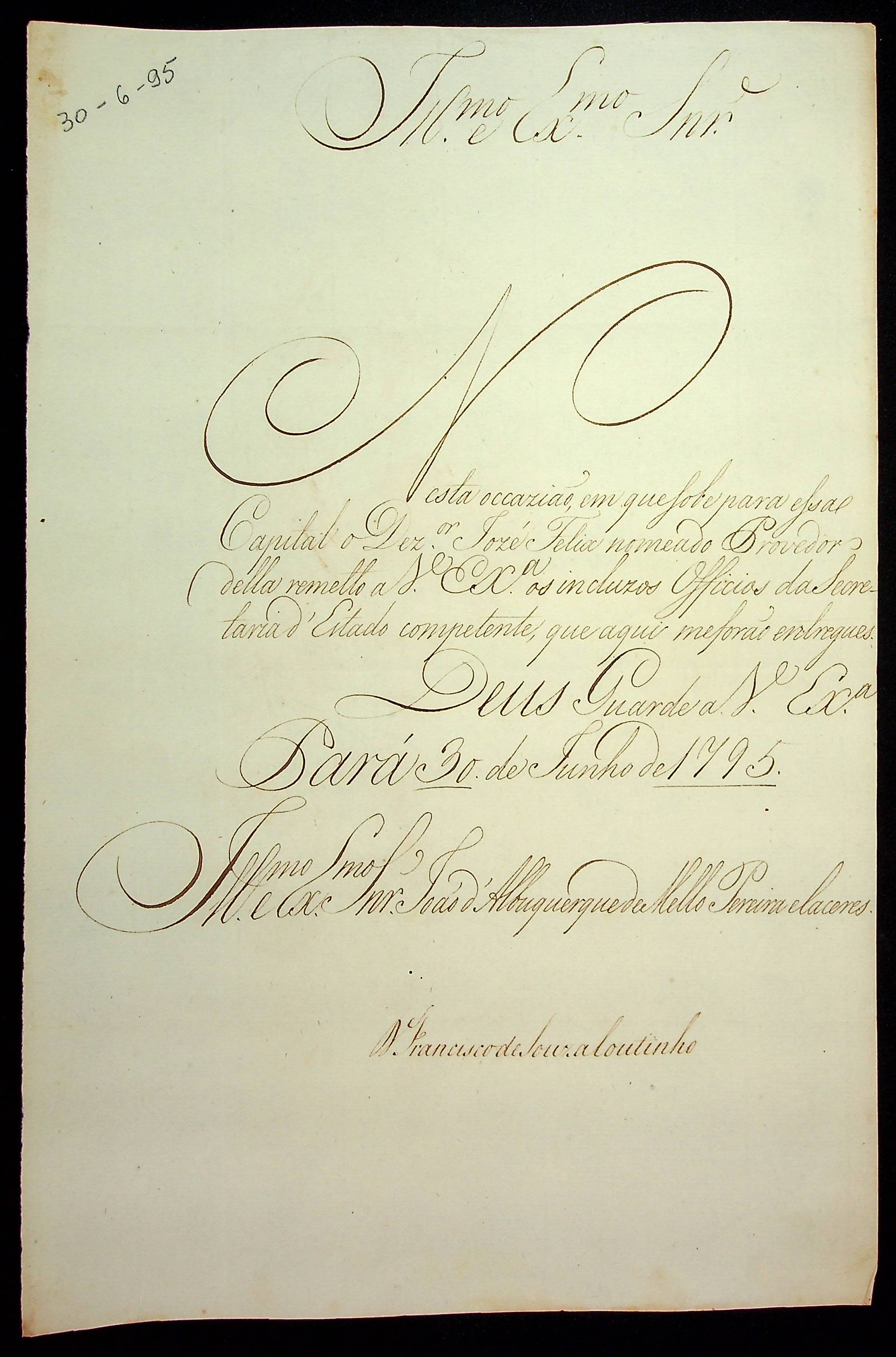 CARTA de Francisco de Souza Coutinho ao [Governador e Capitão General da Capitania de Mato Grosso] João de Albuquerque de Mello Pereira e Cáceres.