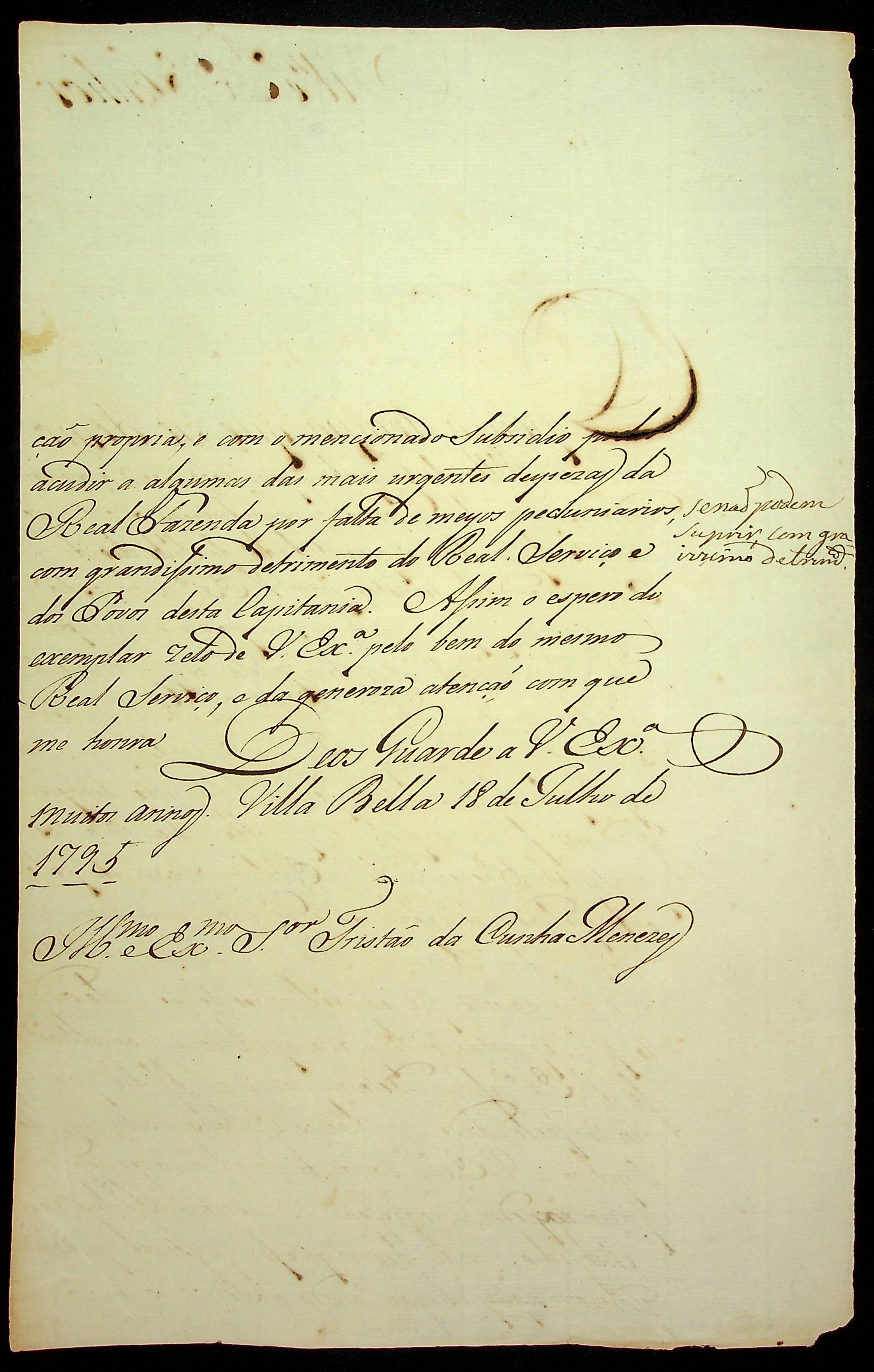 CARTA do [Governador e Capitão-General da Capitania de Mato Grosso João de Albuquerque de Melo Pereira e Cáceres] ao Governador e Capitão-General da Capitania de Goiás] Tristão da Cunha Menezes.