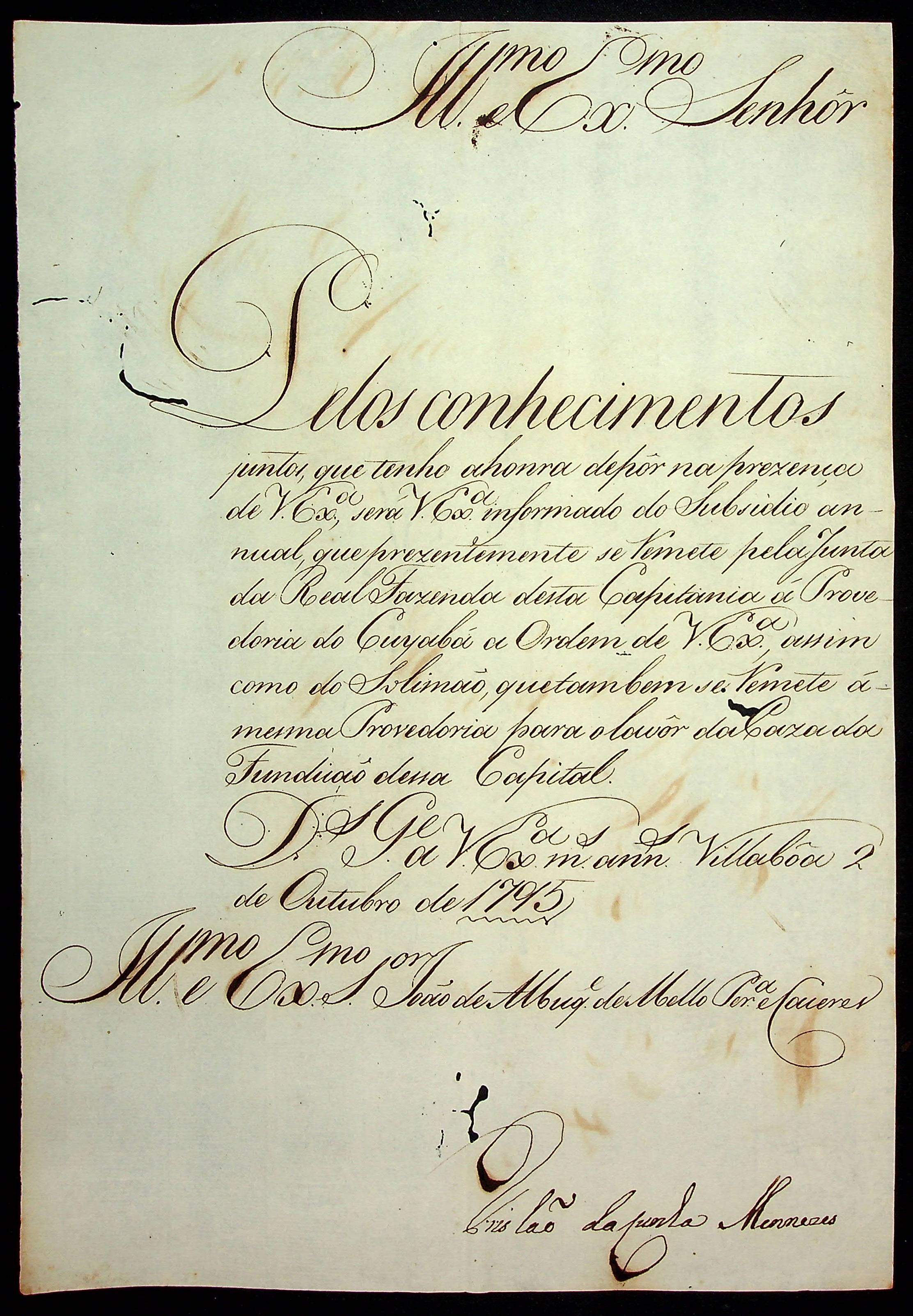 CARTA de Tristão da Cunha Menezes ao [Governador e Capitão General da Capitania de Mato Grosso] João de Albuquerque de Mello Pereira e Cáceres.