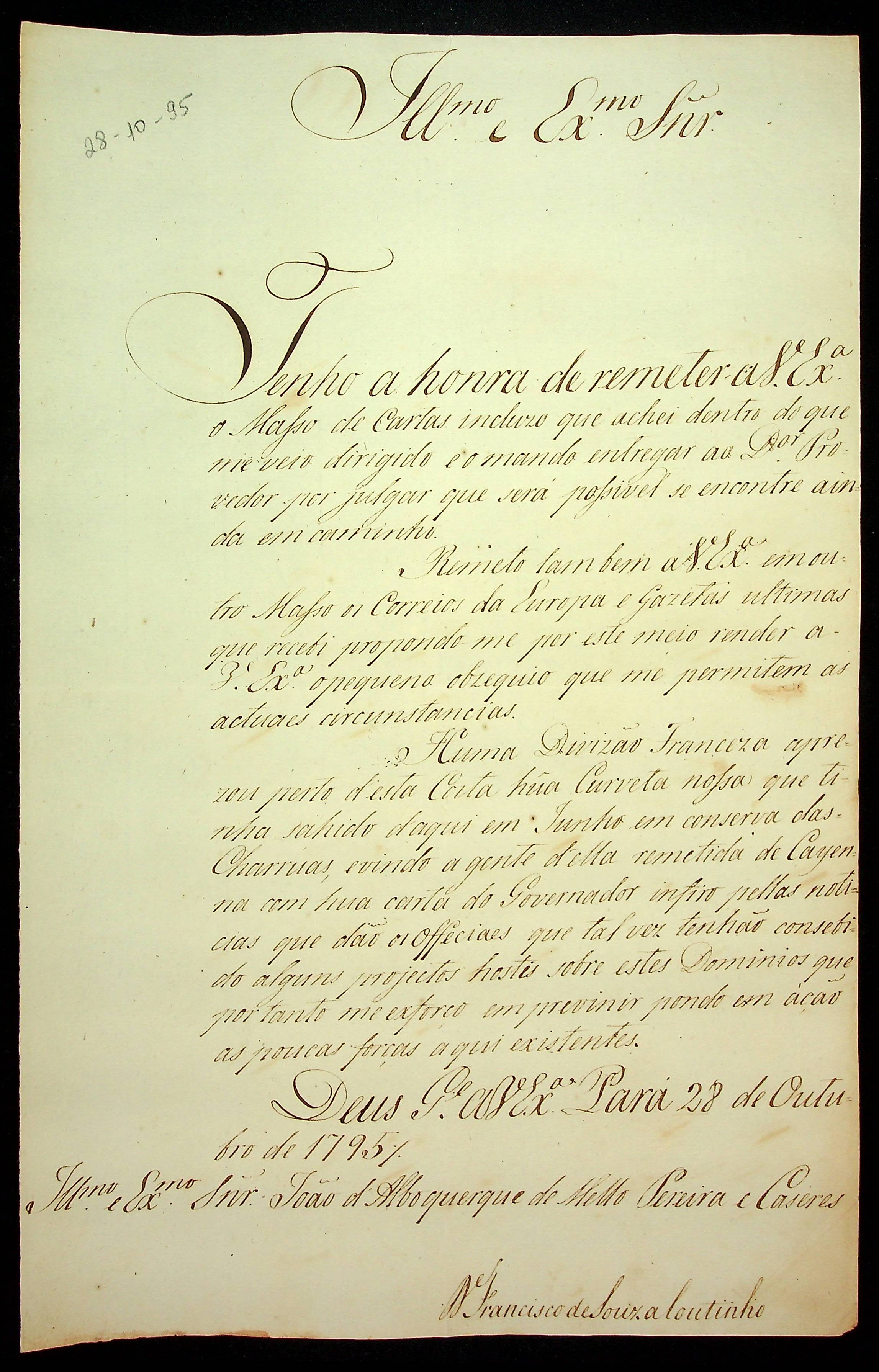 CARTA de Francisco de Souza ao [Governador e Capitão General da Capitania de Mato Grosso] João de Albuquerque de Mello Pereira e Cáceres.