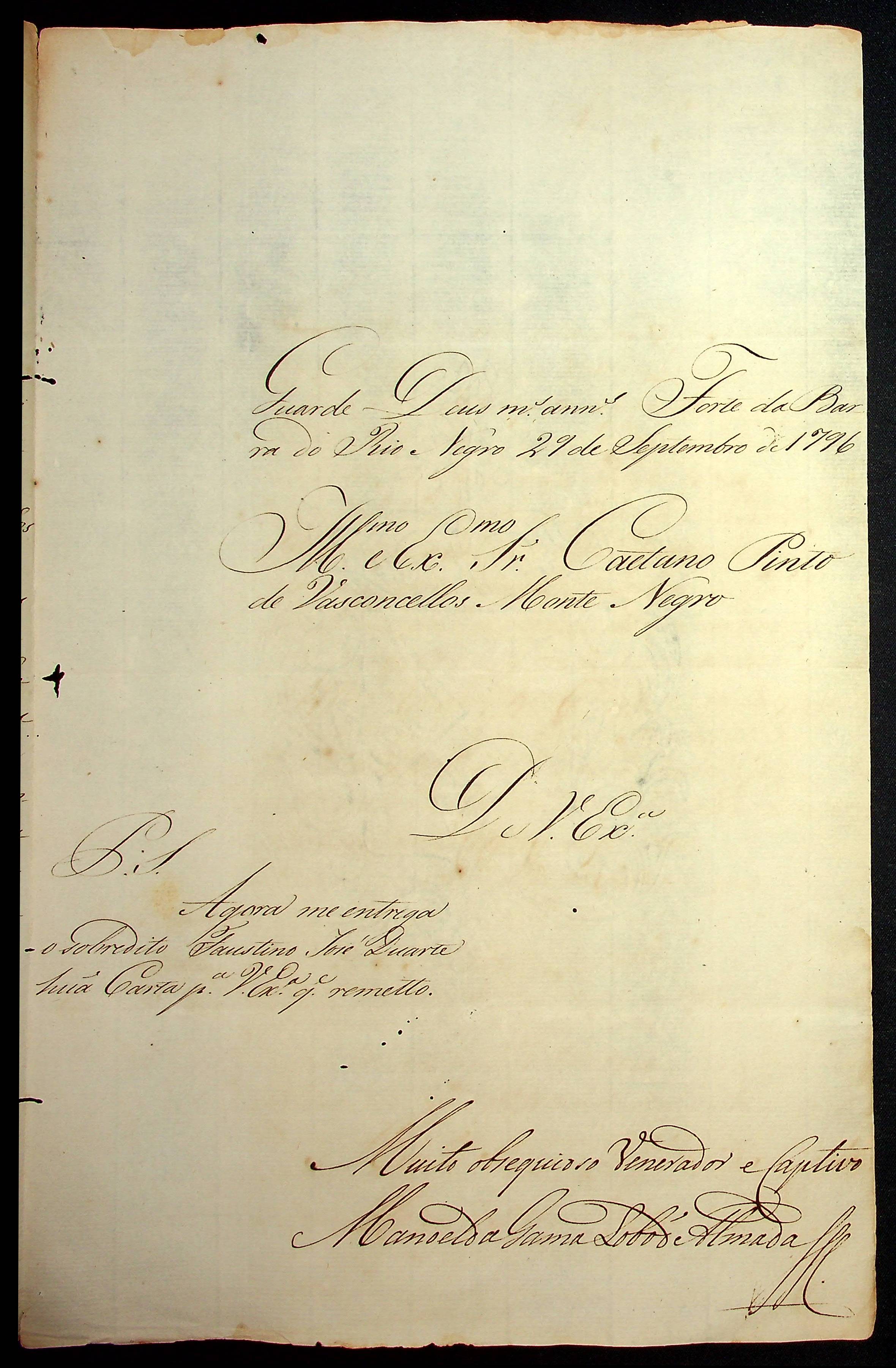 CARTA de Manoel da Gama Lobo de Almada ao [Governador e Capitão-General da Capitania de Mato Grosso] Caetano Pinto de Miranda Vasconcelos e Montenegro.