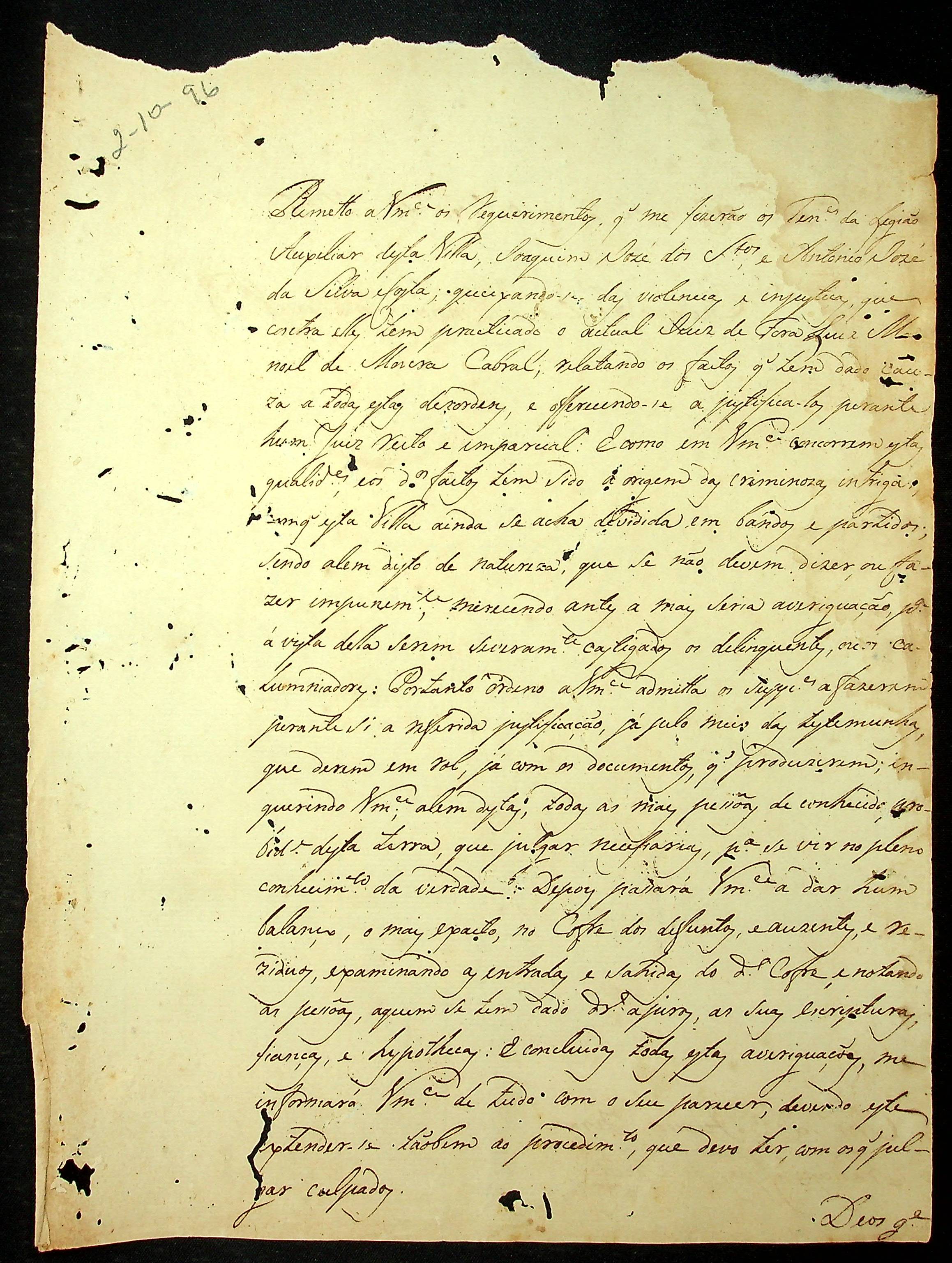 CARTA do [Governador e Capitão-General da Capitania de Mato Grosso] Caetano Pinto de Miranda Vasconcelos e Montenegro ao Ouvidor Geral Francisco Lopes de Souza.