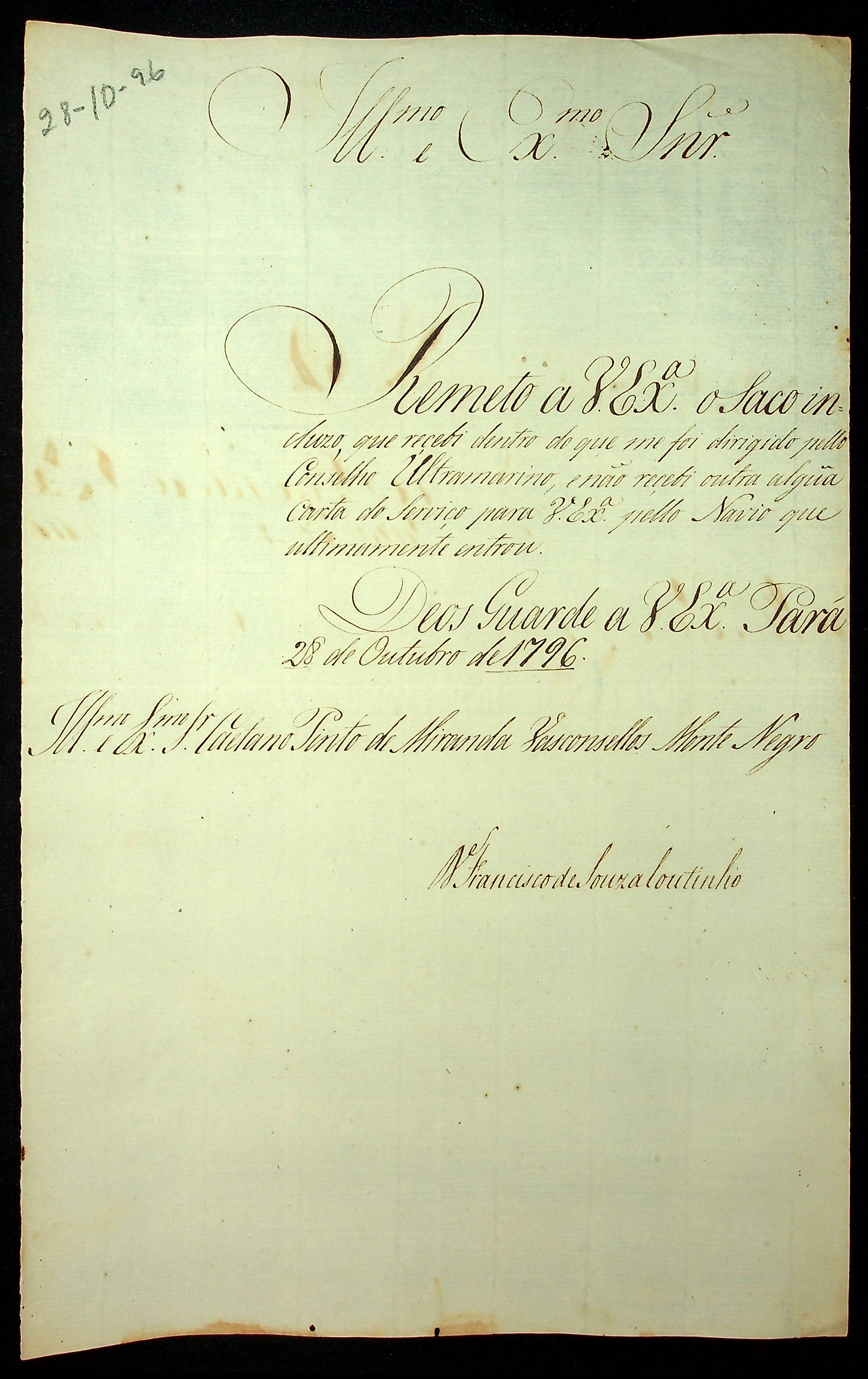 CARTA de Francisco de Souza Coutinho ao [Governador e Capitão-General da Capitania de Mato Grosso] Caetano Pinto de Miranda Vasconcelos e Montenegro.