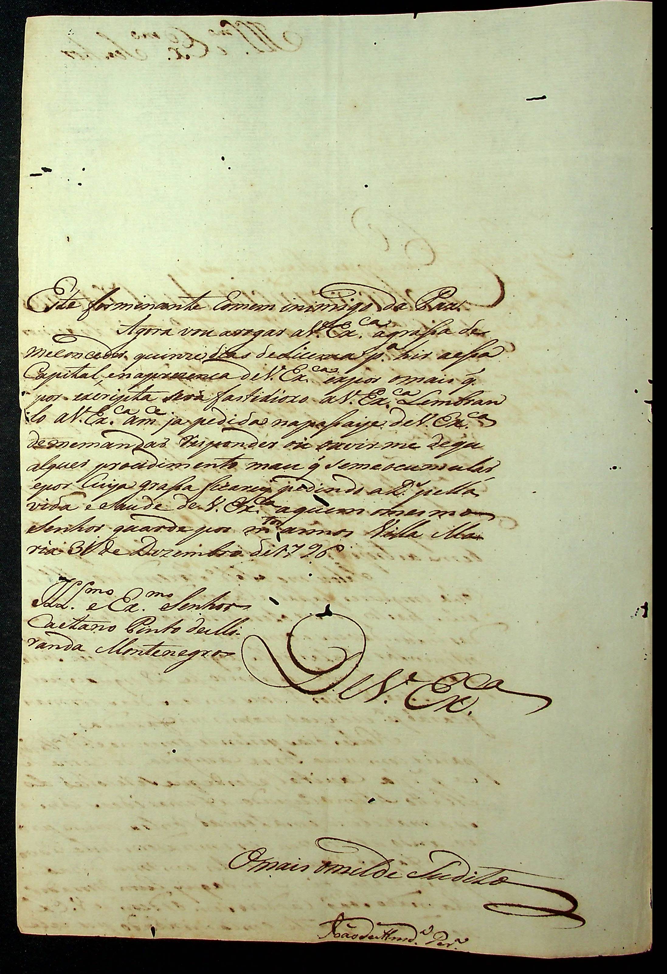 CARTA de João de Almeida Pereira ao [Governador e Capitão-General da Capitania de Mato Grosso] Caetano Pinto de Miranda Vasconcelos e Montenegro.