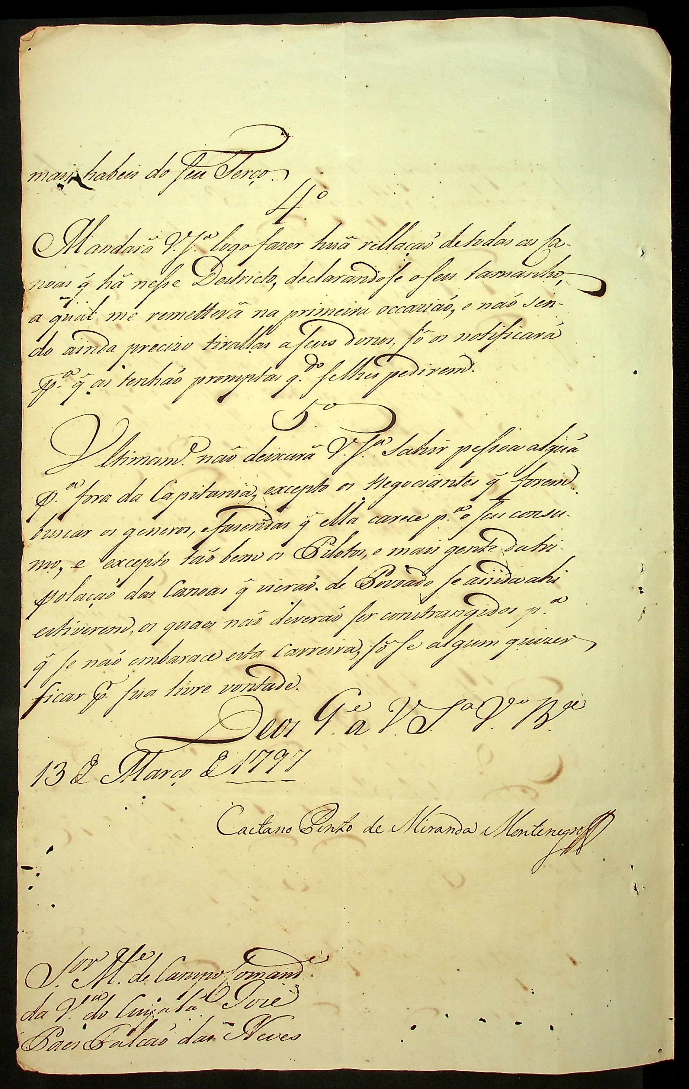 CARTA do [Governador e Capitão-General da Capitania de Mato Grosso] Caetano Pinto de Miranda e Montenegro ao Mestre de Campo e Comandante de Vila do Cuiabá José Paes Falcão das Neves.