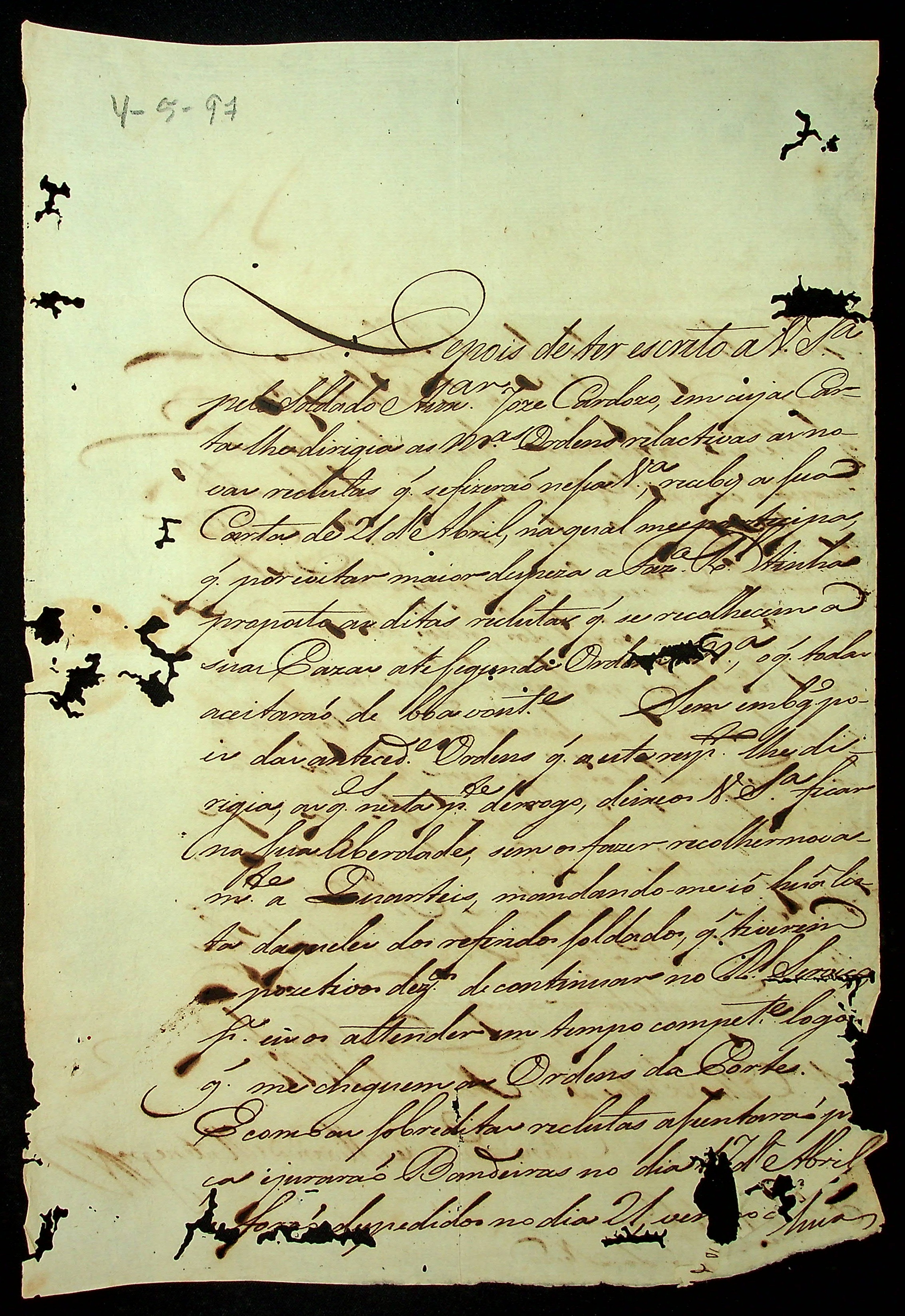CARTA do [Governador e Capitão-General da Capitania de Mato Grosso] Caetano Pinto de Miranda e Montenegro ao Mestre de Campo e [Comandante] José Paes Falcão das Neves.