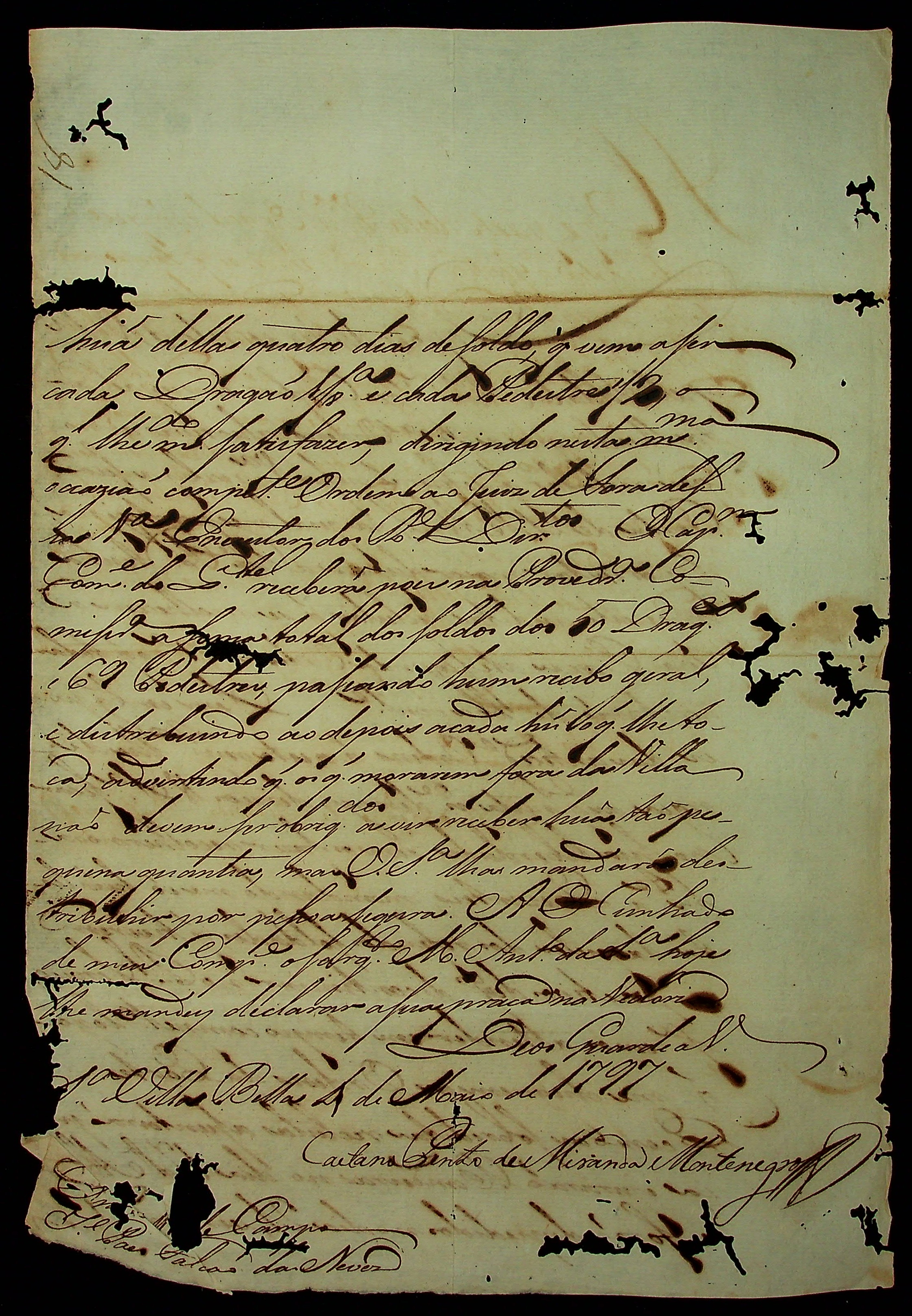 CARTA do [Governador e Capitão-General da Capitania de Mato Grosso] Caetano Pinto de Miranda e Montenegro ao Mestre de Campo e [Comandante] José Paes Falcão das Neves.