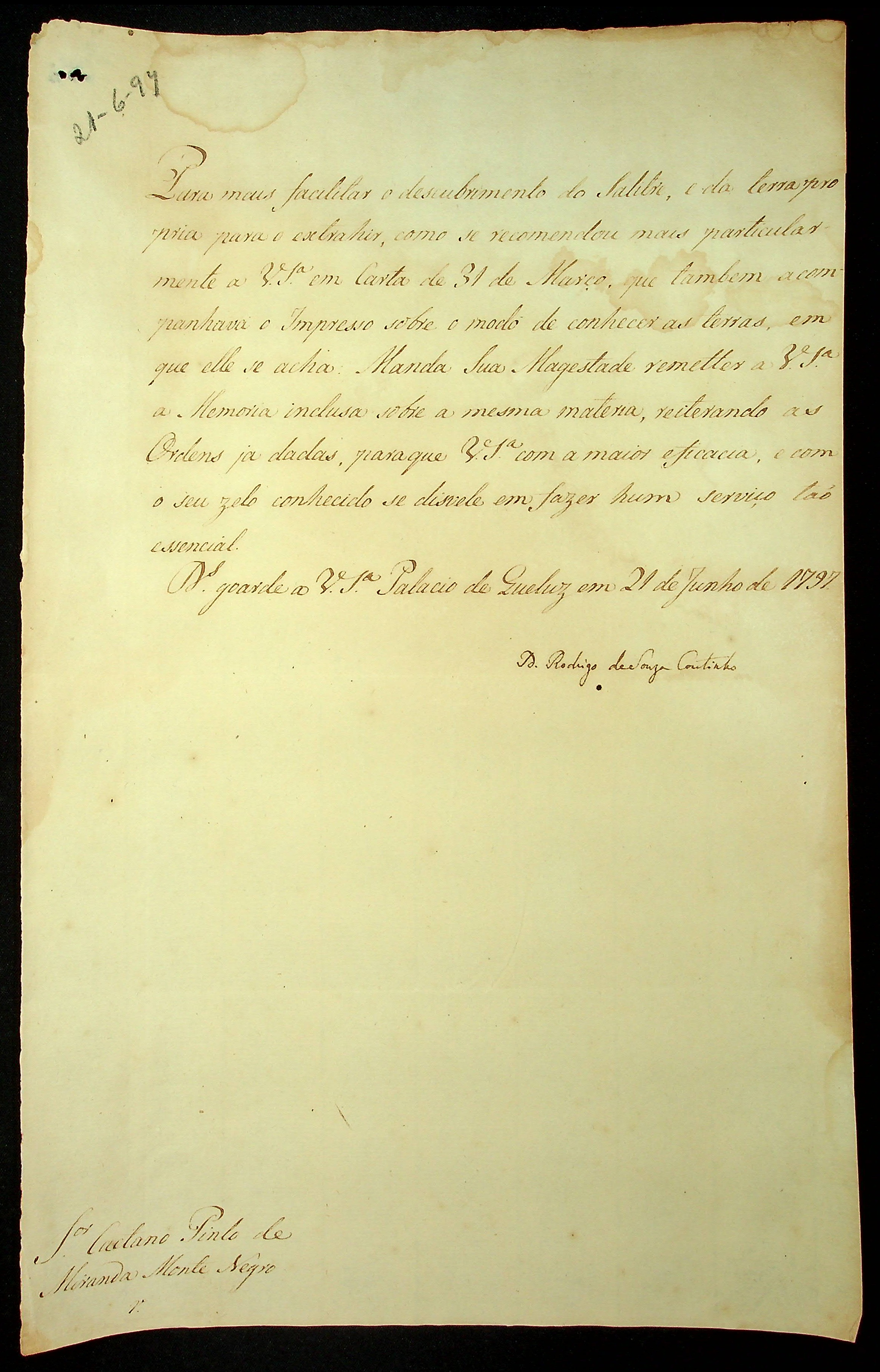 CARTA de Rodrigo de Souza Coutinho ao [Governador e Capitão General da Capitania de Mato Grosso] Caetano Pinto de Miranda e Montenegro.