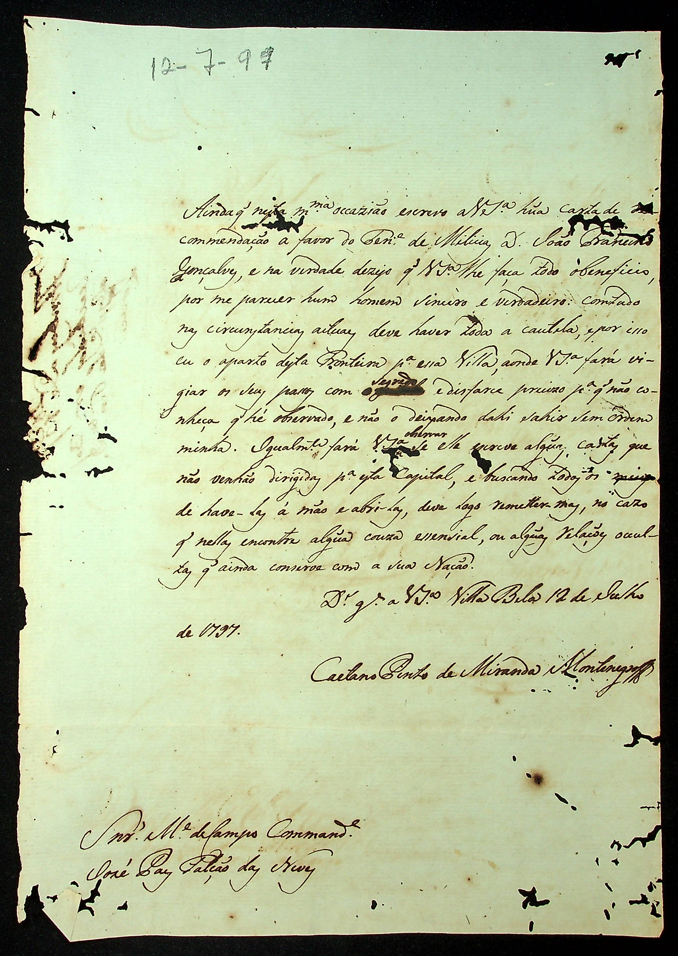 CARTA do [Governador e Capitão-General da Capitania de Mato Grosso] Caetano Pinto de Miranda e Montenegro para o Mestre de Campo e Comandante José Paes Falcão das Neves.