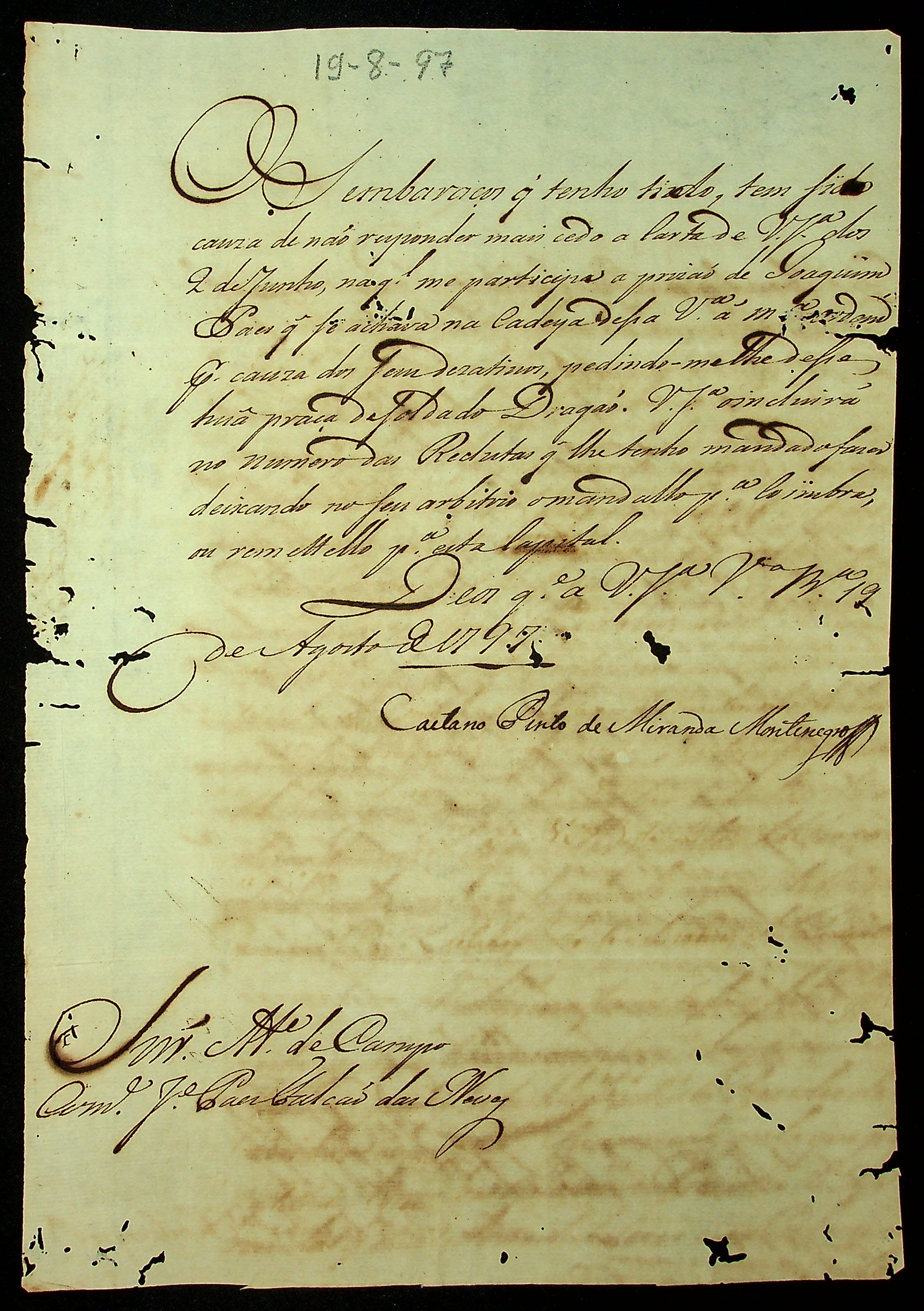 CARTA do [Governador e Capitão-General da Capitania de Mato Grosso] Caetano Pinto de Miranda e Montenegro para o Mestre de Campo e Comandante José Paes Falcão das Neves.