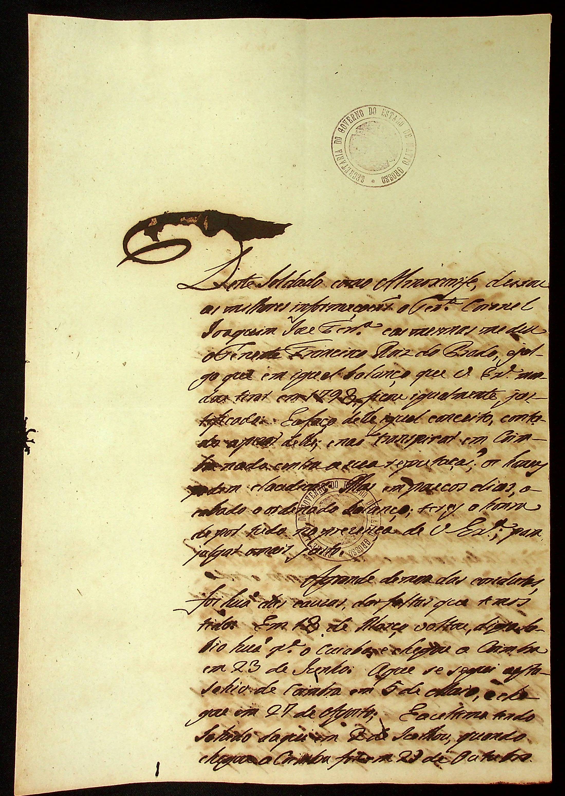 CARTA (incompleta) de [...] ao [Governador e Capitão General da Capitania de Mato Grosso].