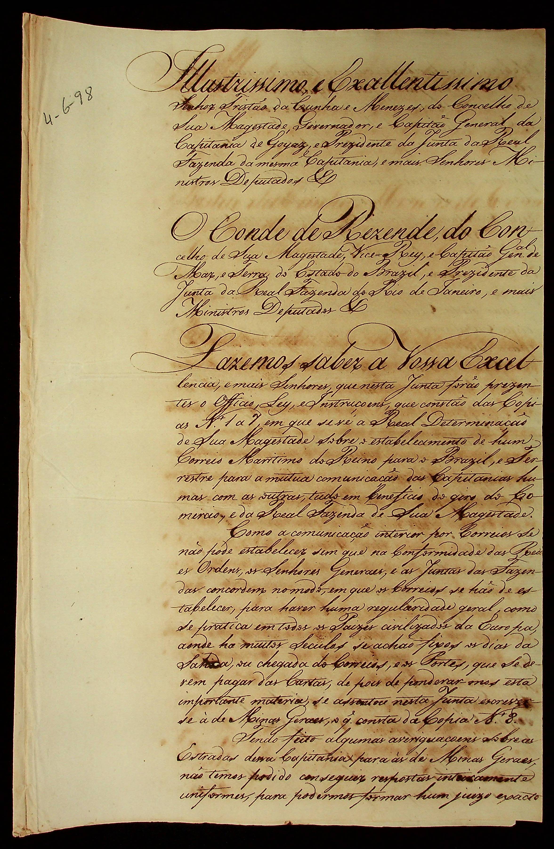 CARTA (cópia) do Conde de Resende Antônio Dinis da Cruz e Silva ao Governador e Capitão-General da Capitania de Goiás, Tristão da Cunha e Menezes.