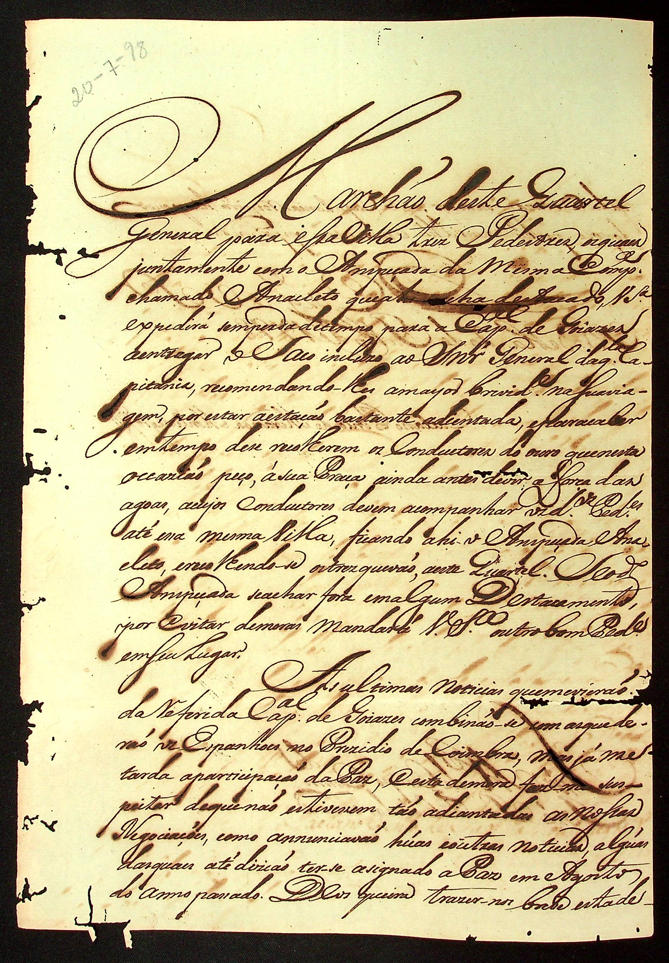 CARTA do [Governador e Capitão-General da capitania de Matogrosso] Caetano Pinto de Miranda e Montenegro para o Mestre de Campo Comandante José Paes Falcão das Neves.