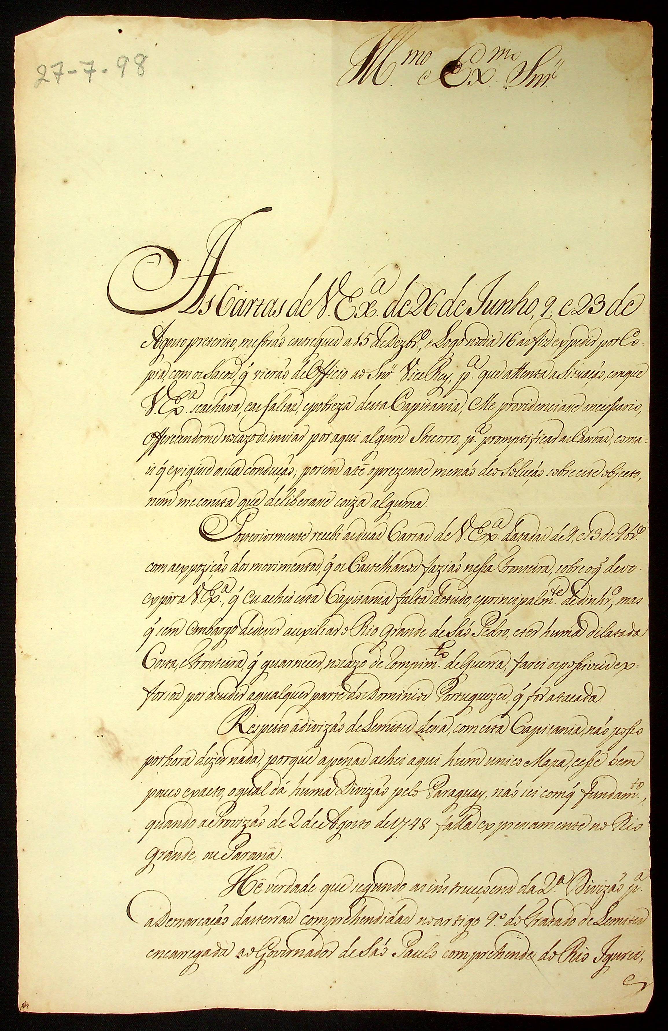 CARTA do [Governador e Capitão-General da Capitania de São Paulo] Antônio Manoel de Melo Castro e Mendonça ao [Governador e Capitão-General da capitania de Matogrosso] Caetano Pinto de Miranda e Montenegro.