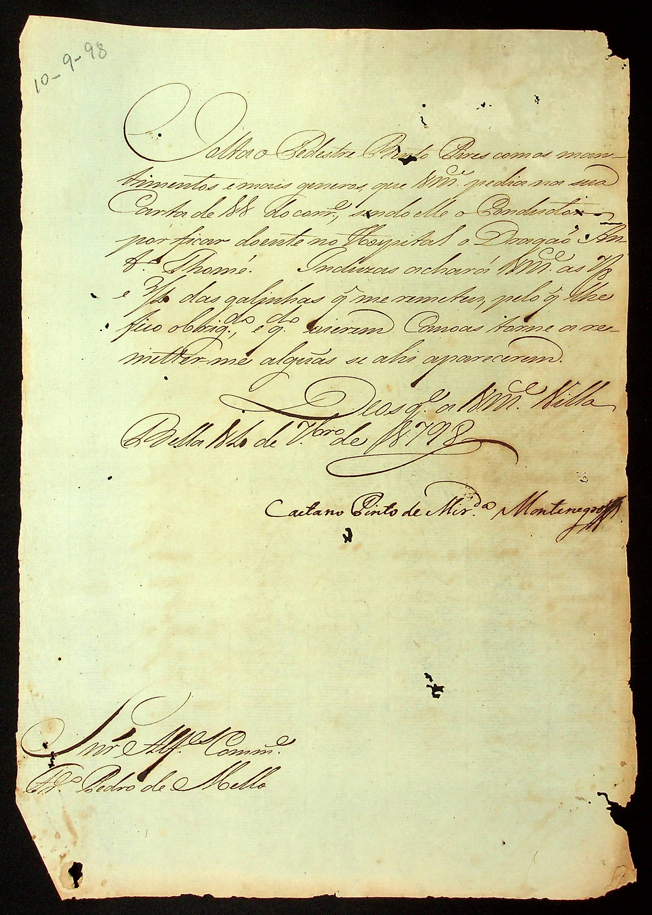 CARTA do [Governador e Capitão-General da Capitania de Mato Grosso] Caetano Pinto de Miranda e Montenegro para o Alferes Comandante Francisco Pedro de Melo.
