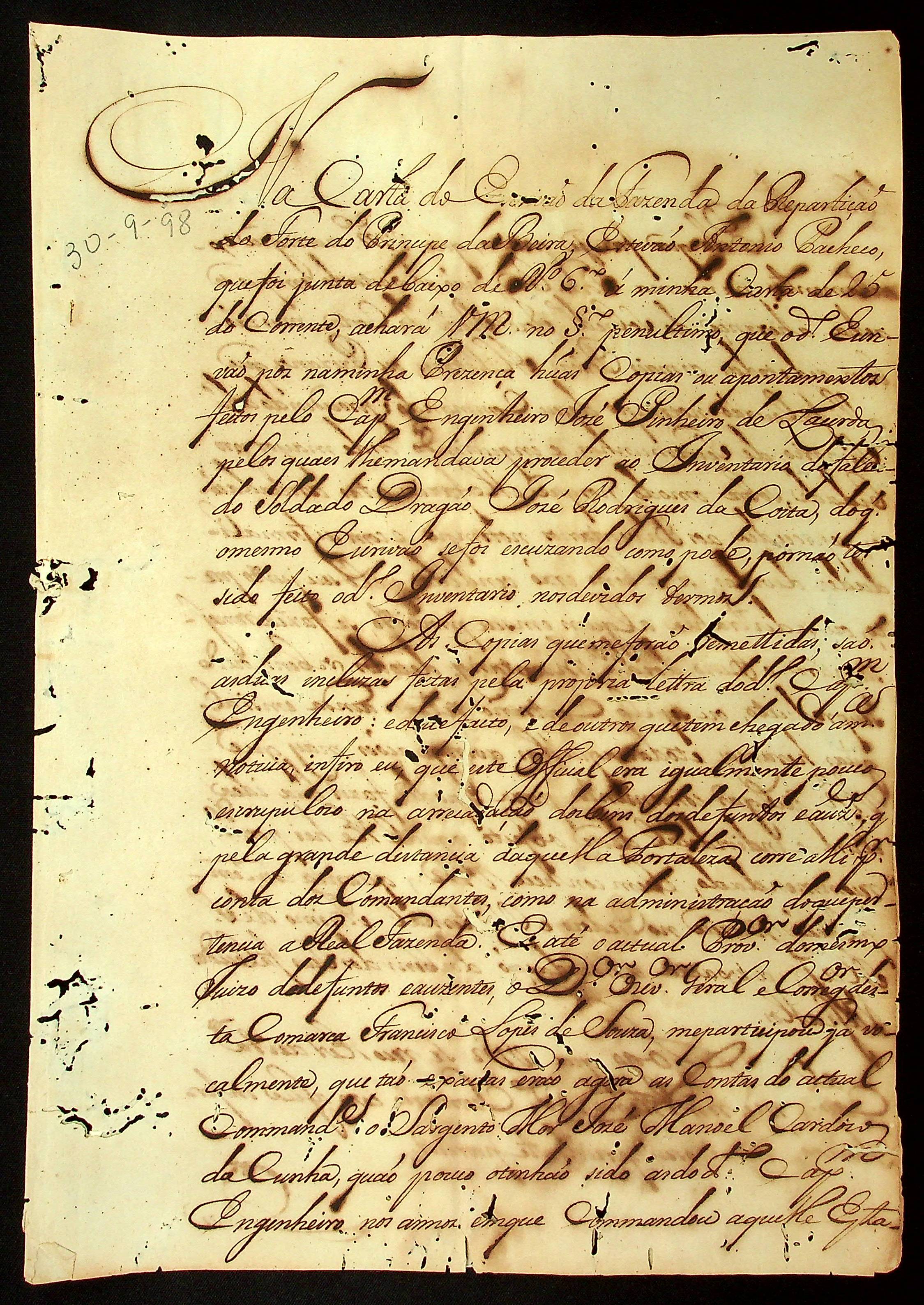 CARTA do [Governador e Capitão-General da Capitania de Mato Grosso] Caetano Pinto de Miranda e Montenegro ao Provedor da Real Fazenda José Felix de Araújo.