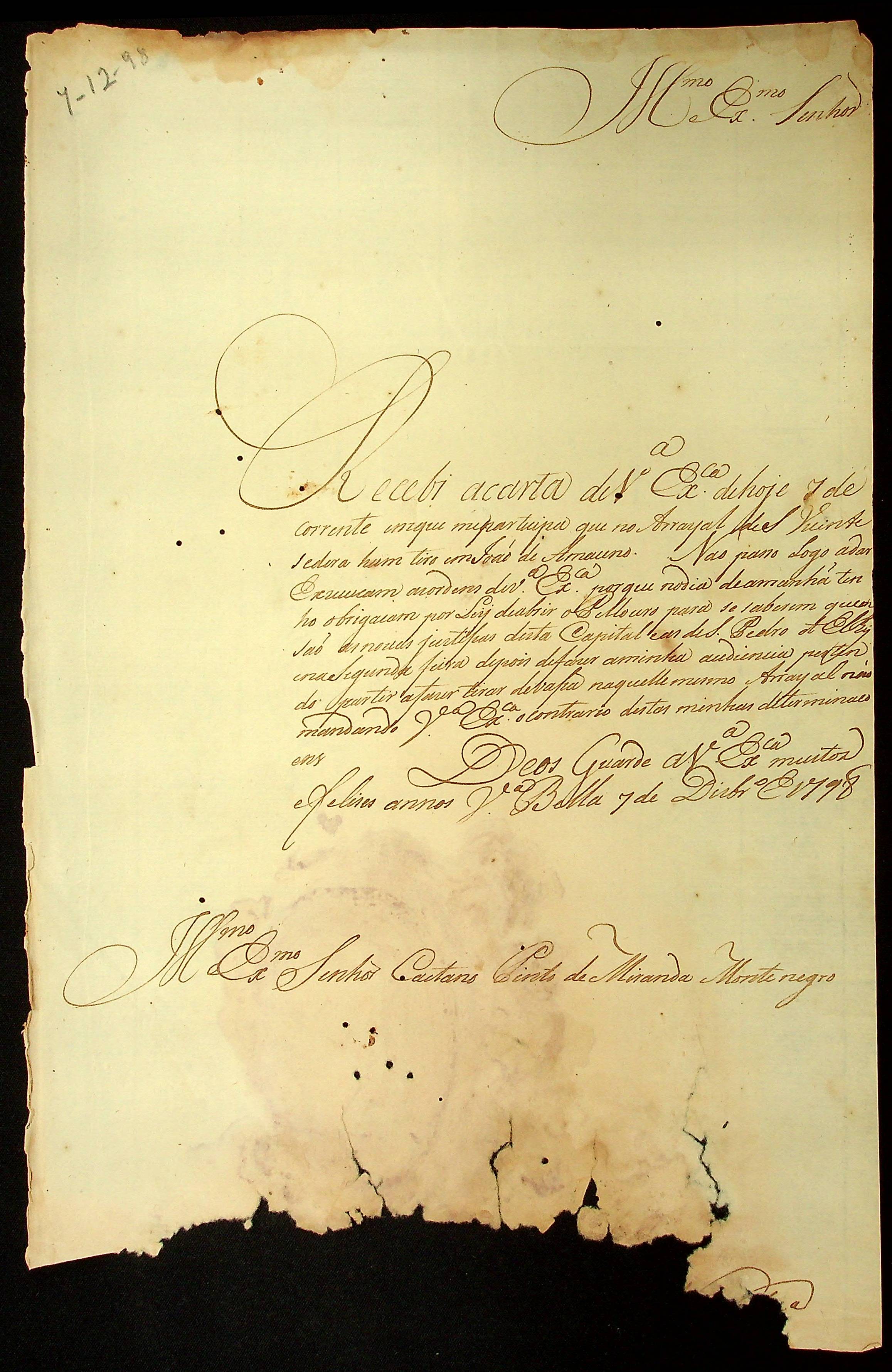 CARTA de [...] ao Governador e Capitão-General da Capitania de Mato Grosso Caetano Pinto de Miranda e Montenegro.