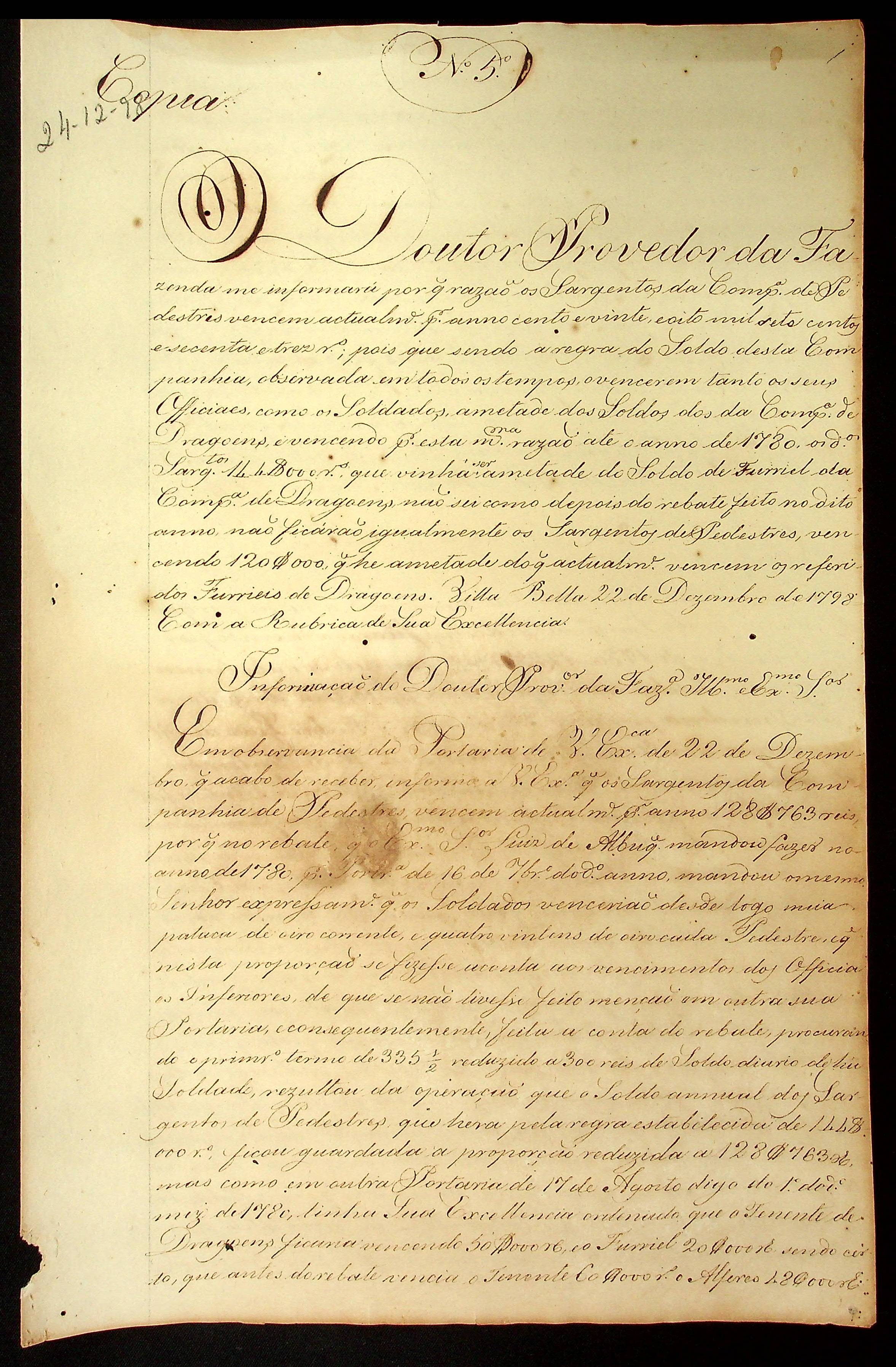CARTA (cópia) do [Governador e Capitão-General da Capitania de Mato Grosso] Caetano Pinto de Miranda Montenegro] ao Doutor Provedor da Real Fazenda Luiz Thomas Navarro de Campos.