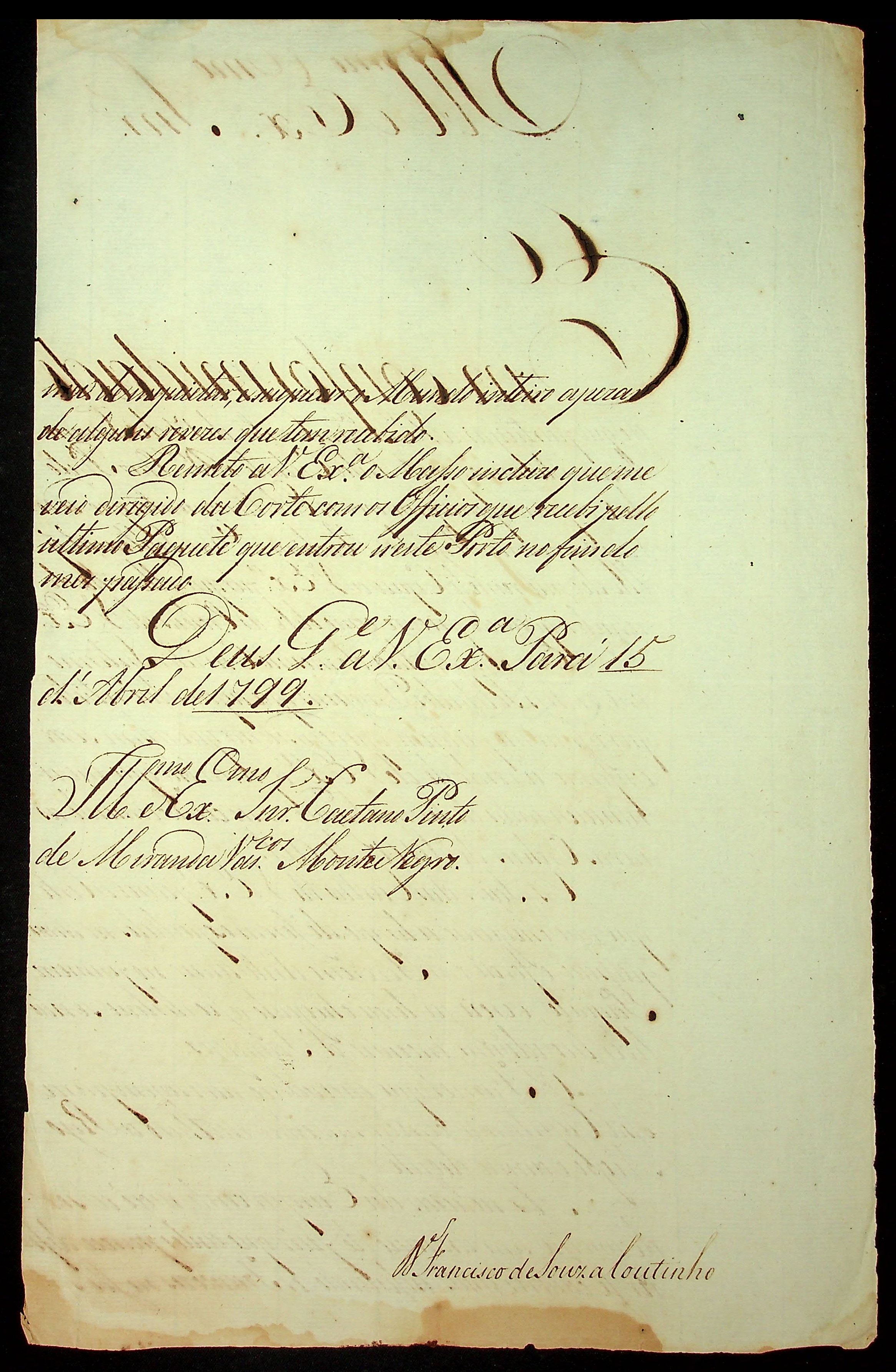 CARTA de Francisco de Souza Coutinho ao [Governador e Capitão-General da Capitania de Mato Grosso] Caetano Pinto de Miranda e Montenegro.