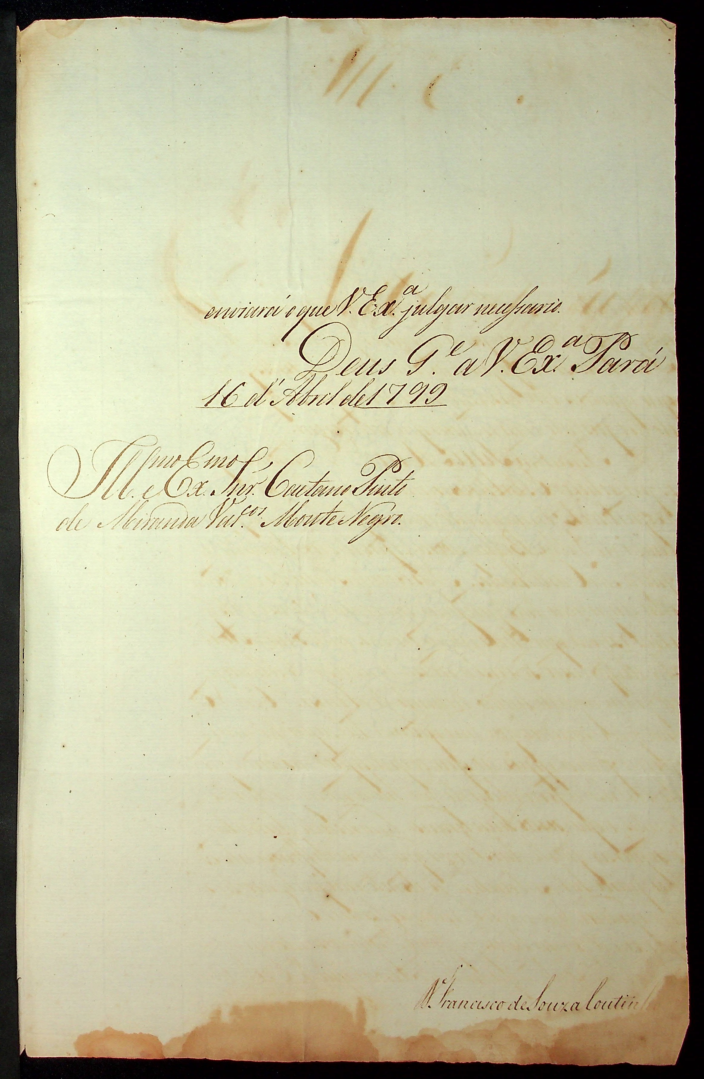 CARTA de Francisco de Souza Coutinho ao [Governador e Capitão-General da Capitania de Mato Grosso] Caetano Pinto de Miranda e Montenegro.
