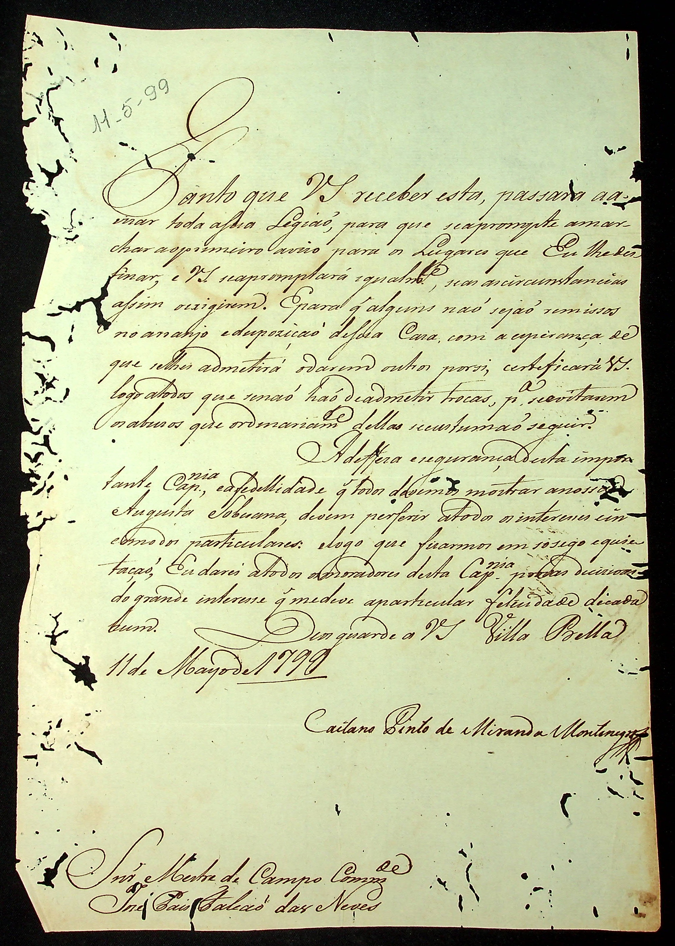CARTA do [Governador e Capitão-General da Capitania de Mato Grosso] Caetano Pinto de Miranda e Montenegro ao Mestre de Campo Comandante José Paes Falcão Paes das Neves.