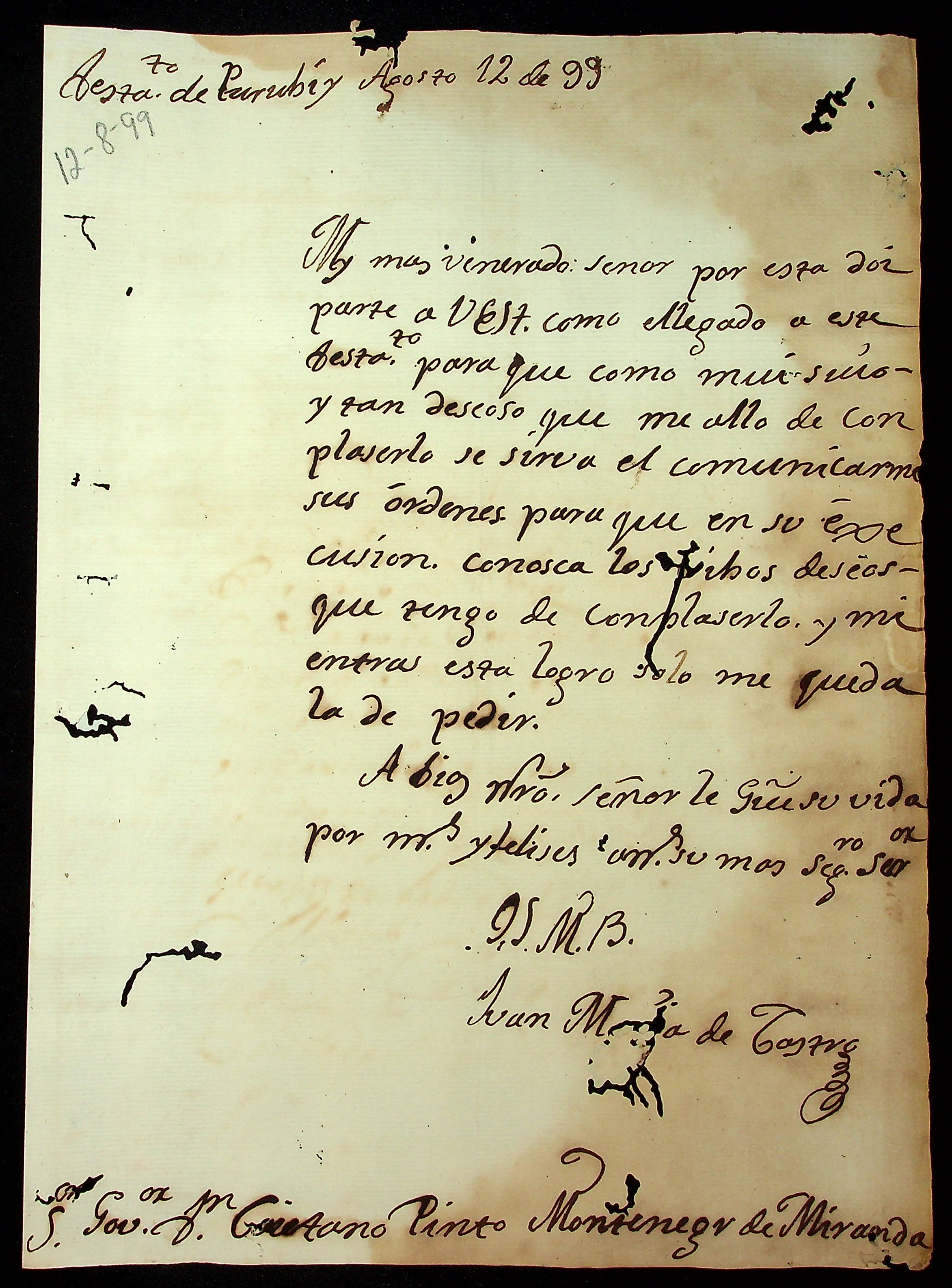 CARTA de Juan [M.] de Castro ao [Governador e Capitão-General da Capitania de Mato Grosso] Caetano Pinto de Miranda e Montenegro.