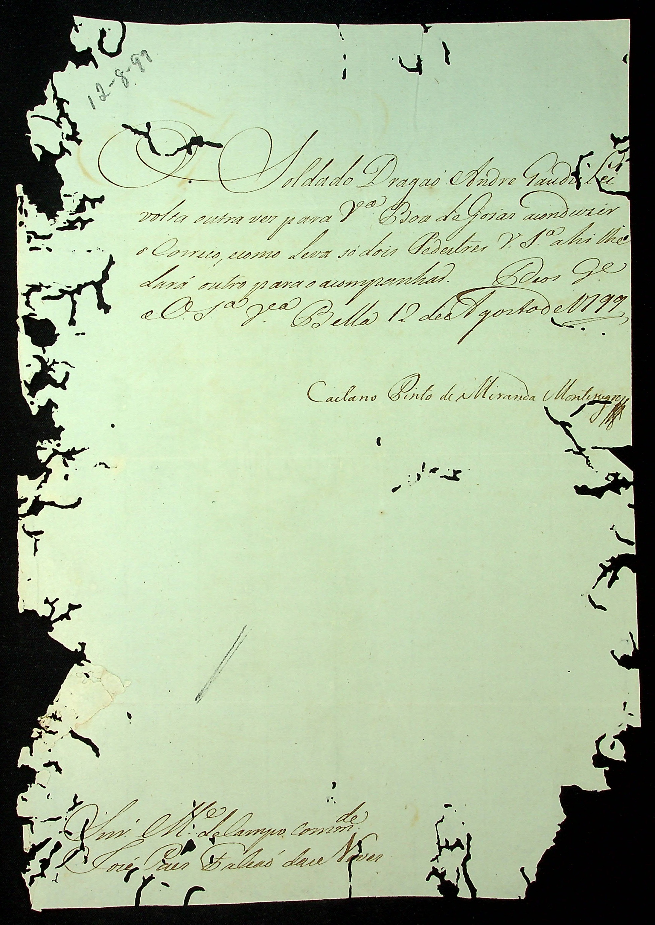 CARTA do Governador e Capitão-General da Capitania de Mato Grosso Caetano Pinto de Miranda e Montenegro ao Mestre de Campo Comandante da [Vila do Cuiabá] José Paes Falcão das Neves.