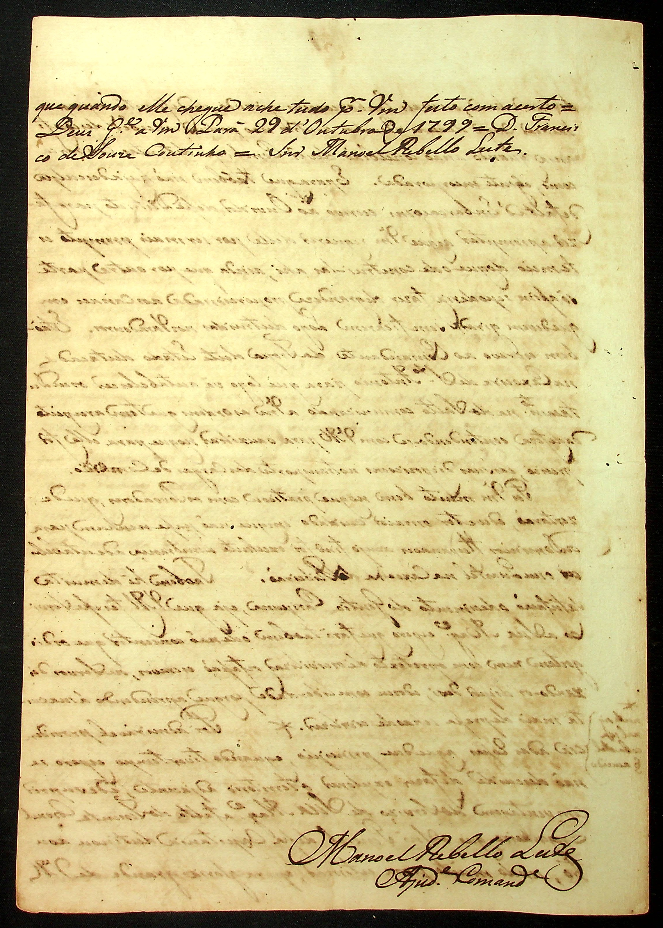 CARTA (cópia) de Francisco de Souza Coutinho ao Ajudante e Comandante do [Quartel da Cachoeira do Ribeirão] Manoel Rabello Leite.
