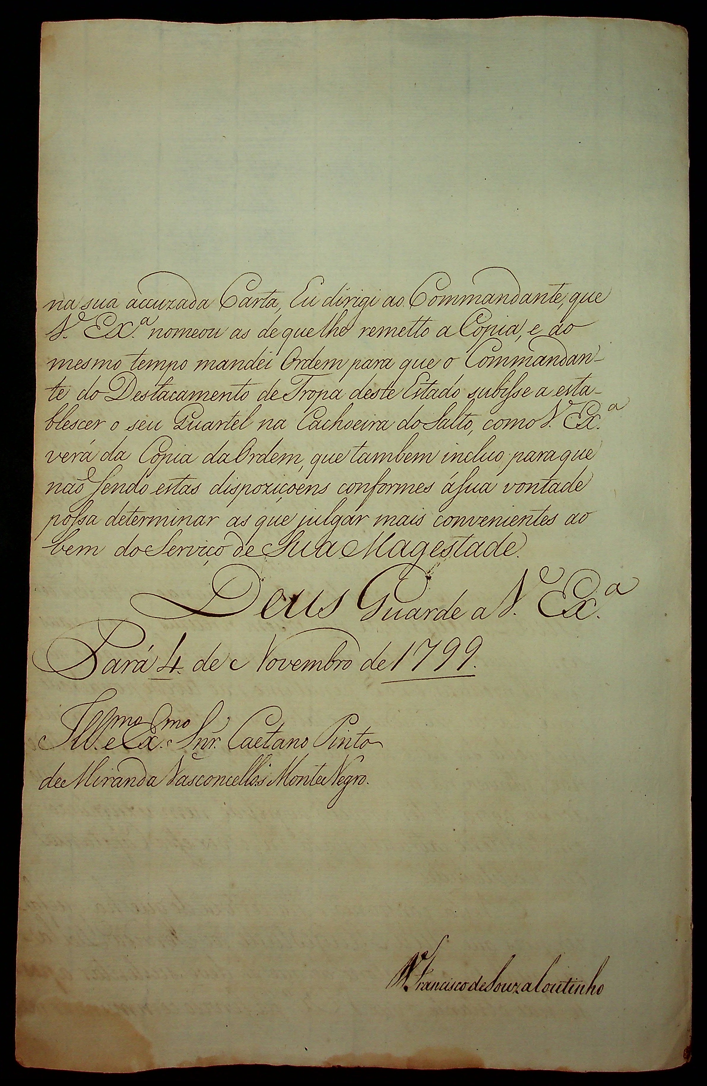 CARTA de Francisco de Souza Coutinho ao [Governador e Capitão-General da Capitania de Mato Grosso] Caetano Pinto de Miranda e Montenegro.