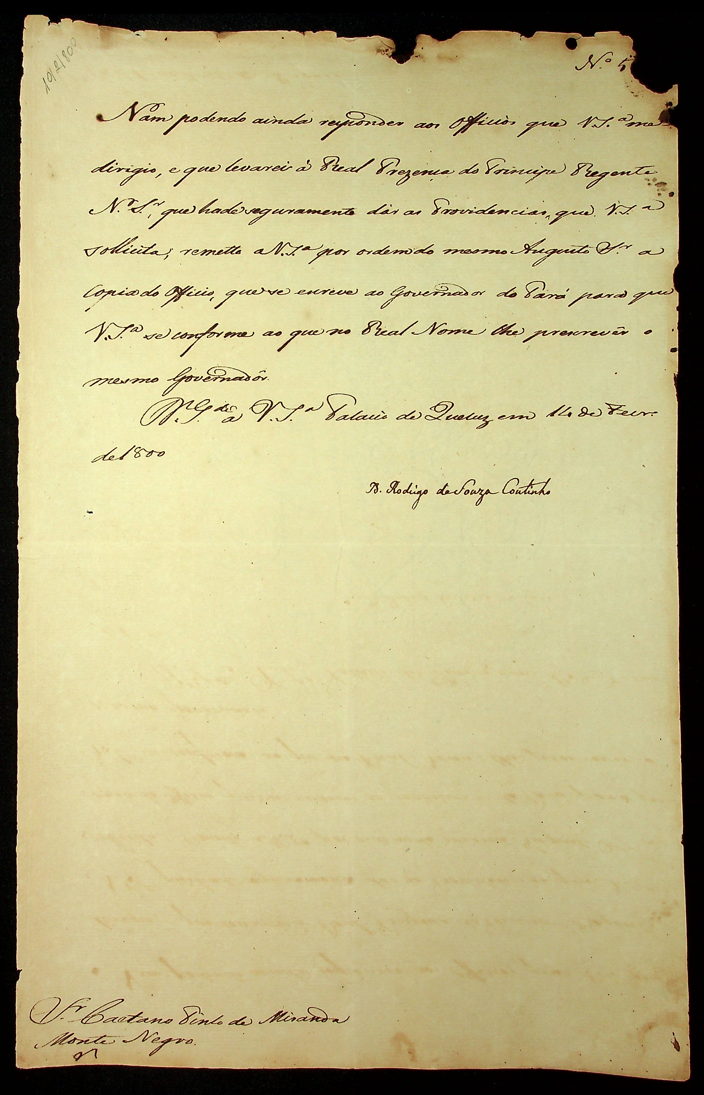 CARTA de Rodrigo de Souza Coutinho ao [Governador e Capitão General da Capitania de Mato Grosso] Caetano Pinto de Miranda Montenegro.
