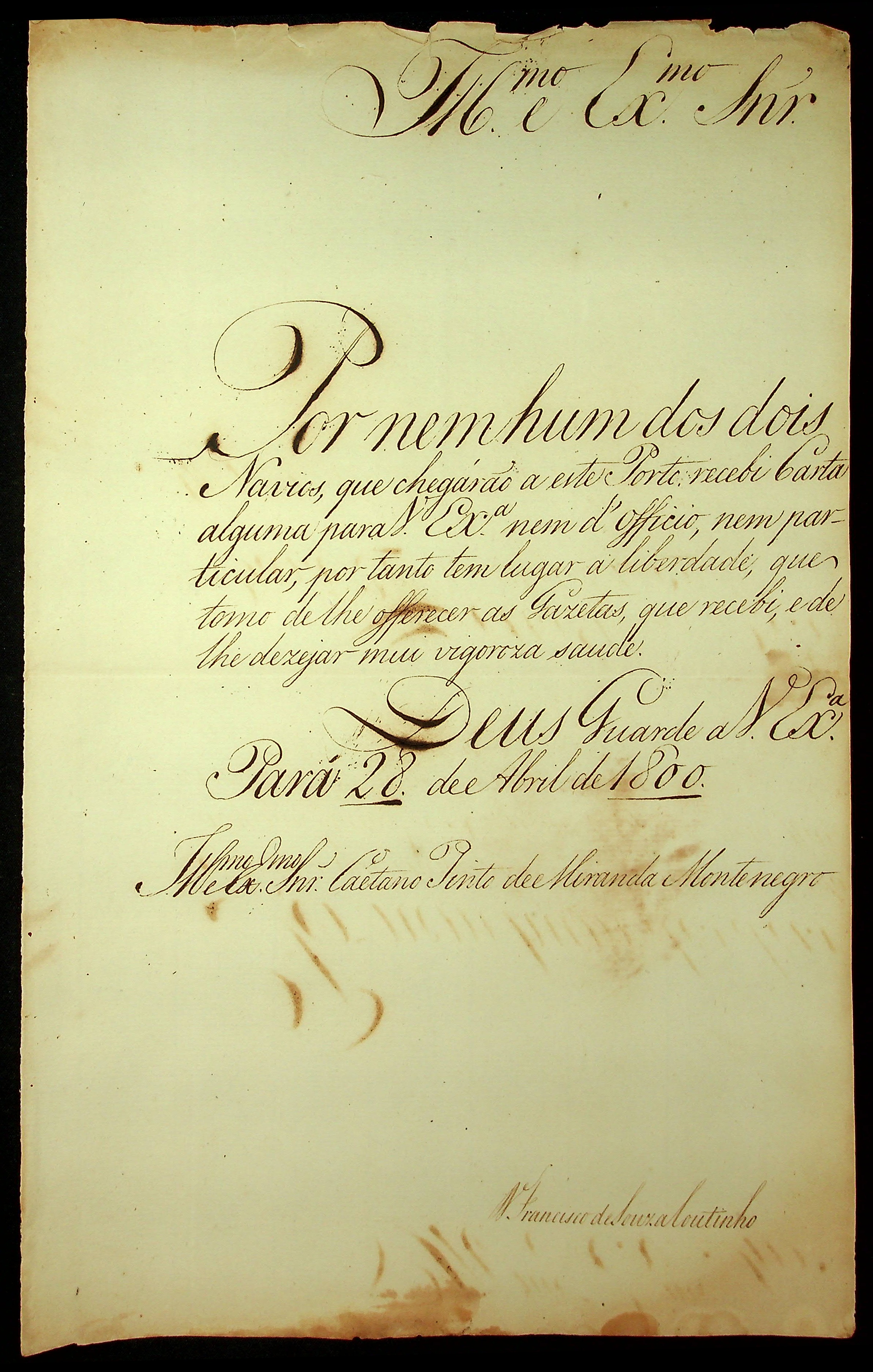 CARTA de Francisco de Souza Coutinho ao [Governador e Capitão General da Capitania de Mato Grosso] Caetano Pinto de Miranda Montenegro.