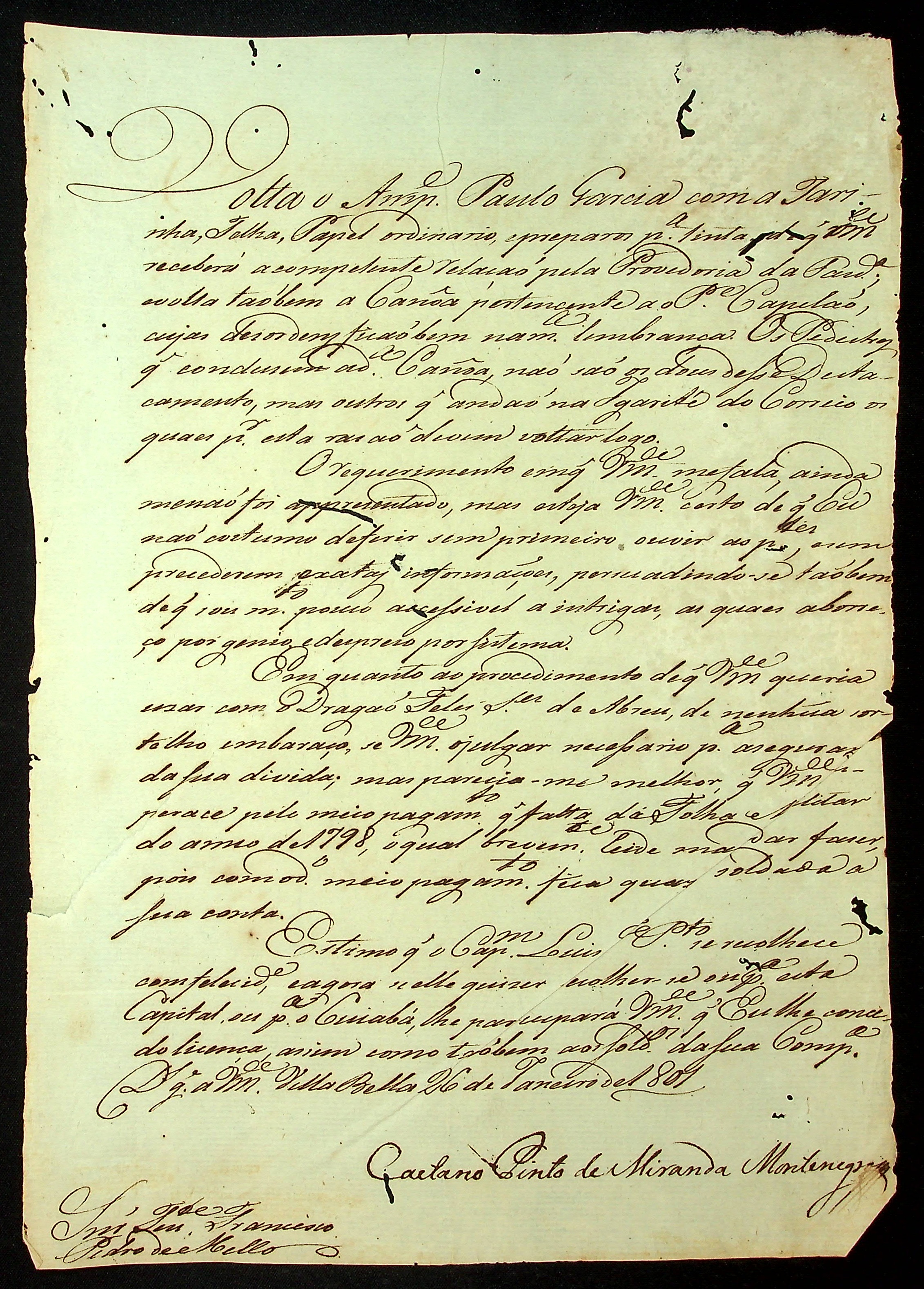CARTA do [Governador e Capitão General da Capitania de Mato Grosso] Caetano Pinto de Miranda Montenegro ao Tenente Francisco Pedro de Mello.