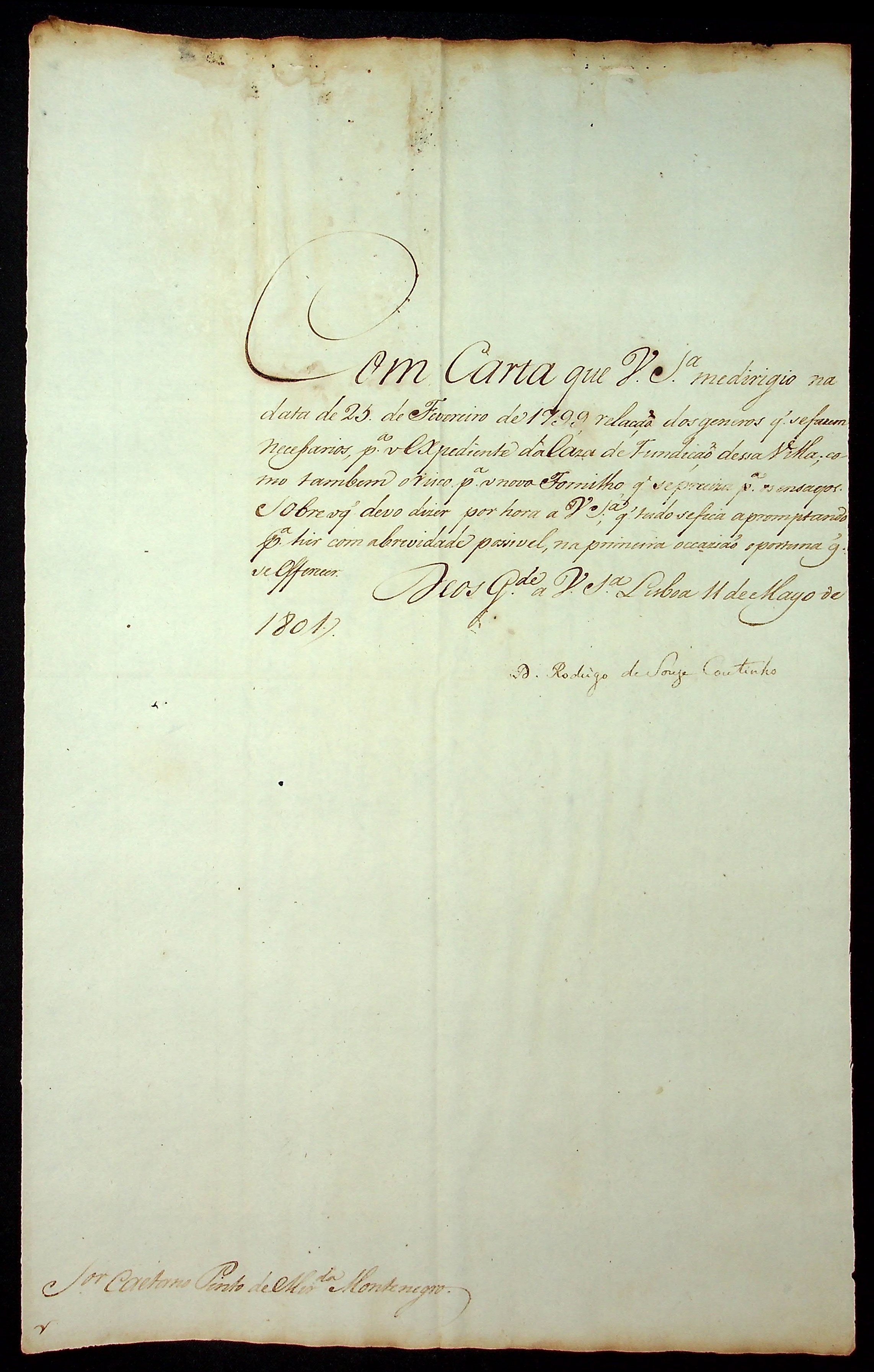 CARTA do [Secretário do Ultramar] Rodrigo de Souza Coutinho ao [Governador e Capitão General da Capitania de Mato Grosso] Caetano Pinto de Miranda Montenegro.