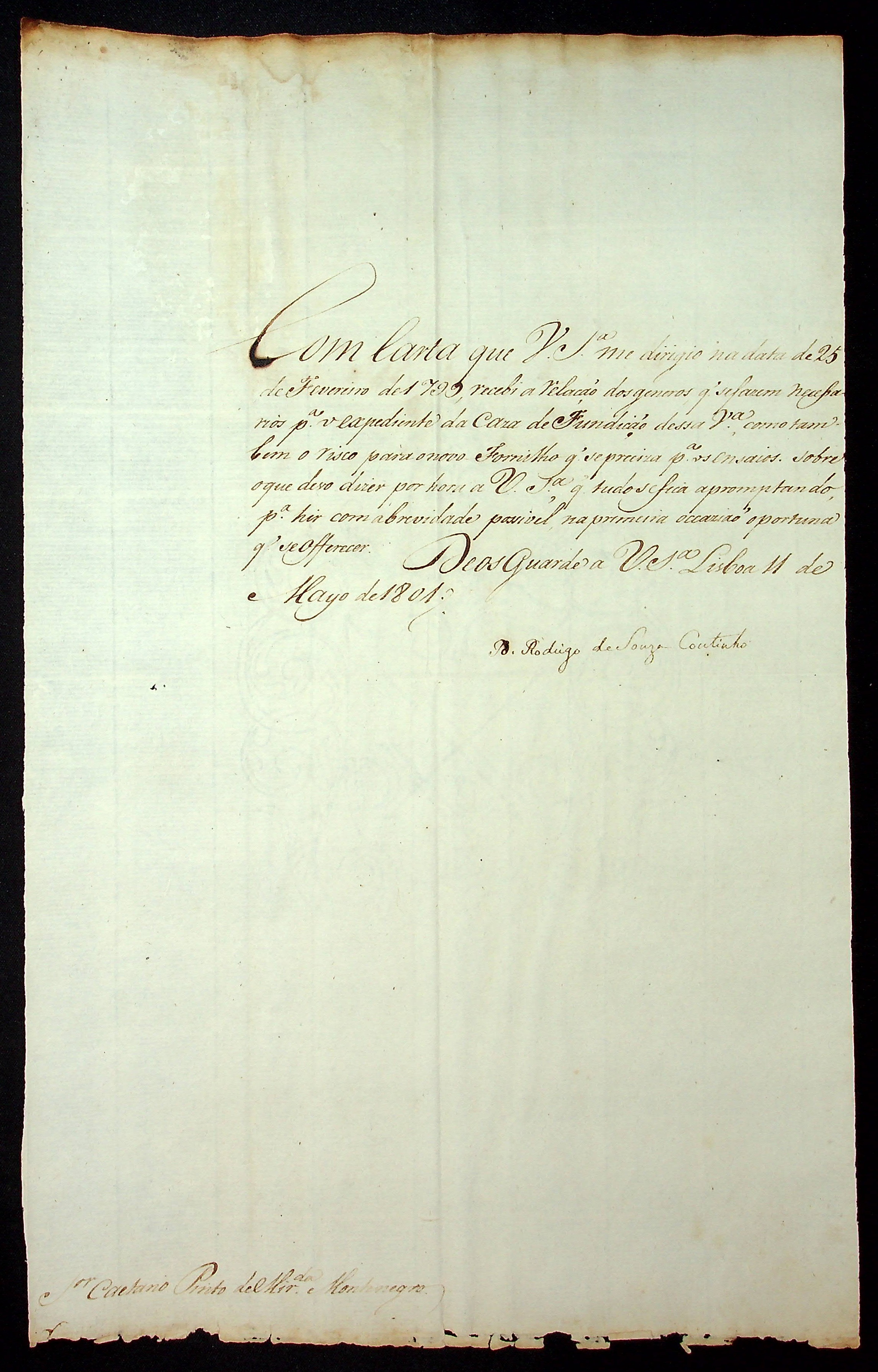 CARTA do [Secretário do Ultramar] Rodrigo de Souza Coutinho ao [Governador e Capitão General da Capitania de Mato Grosso] Caetano Pinto de Miranda Montenegro.