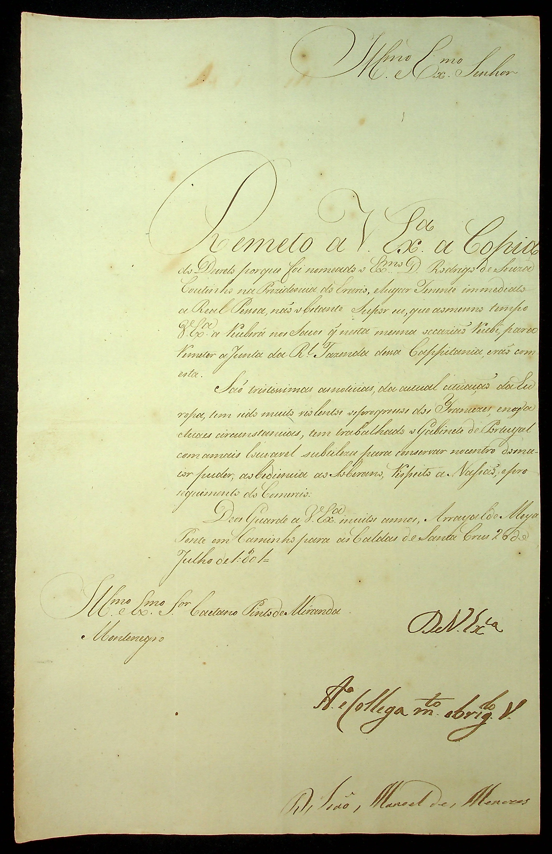 CARTA do [Governador e Capitão-General da Capitania de Goiás] João Manoel de Menezes ao [Governador e Capitão General da Capitania de Mato Grosso] Caetano Pinto de Miranda Montenegro.