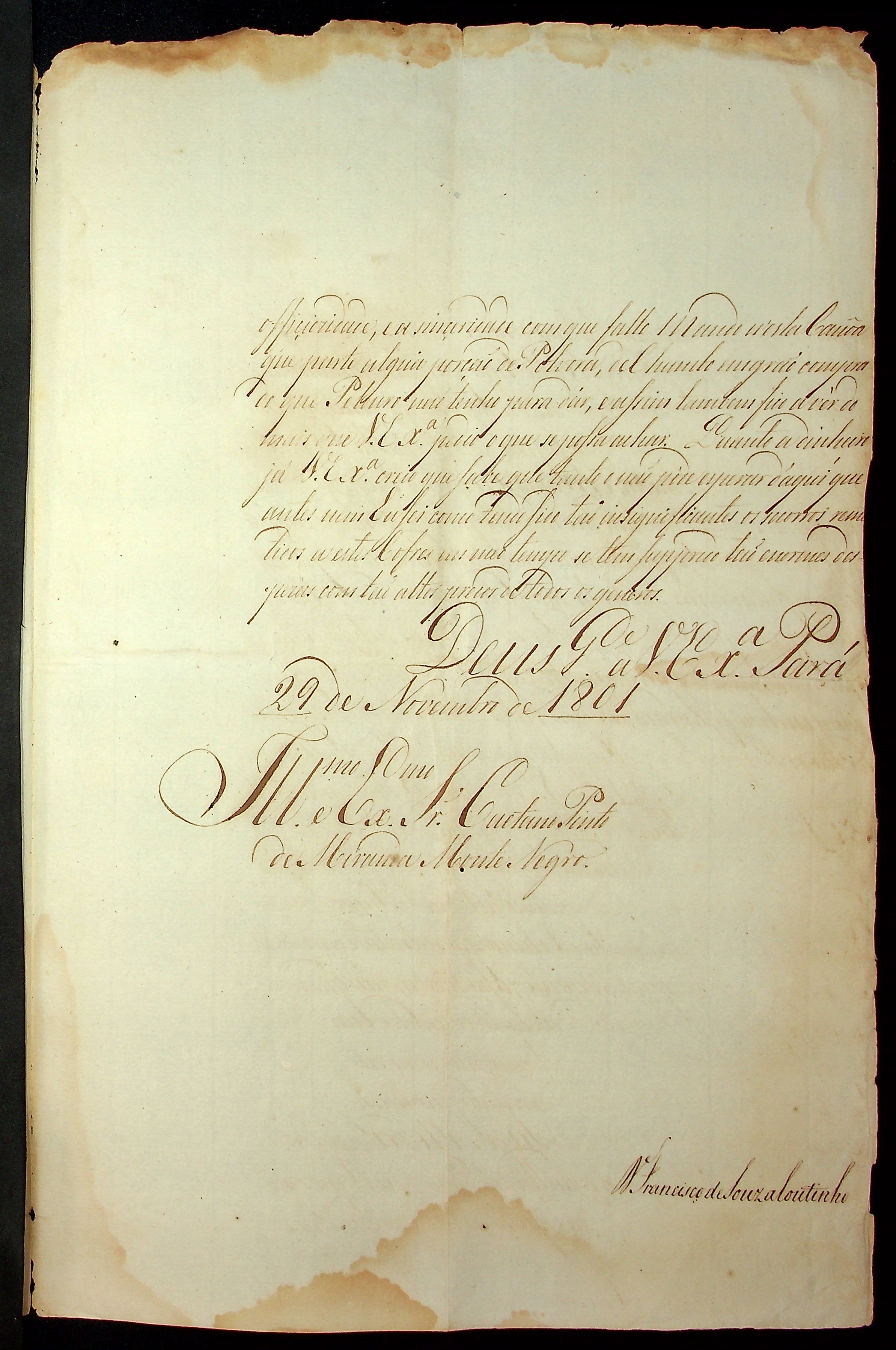 CARTA do [Governador e Capitão-General da Capitania do Grão Pará e Maranhão] Francisco de Souza Coutinho ao [Governador e Capitão General da Capitania de Mato Grosso] Caetano Pinto de Miranda Montenegro.