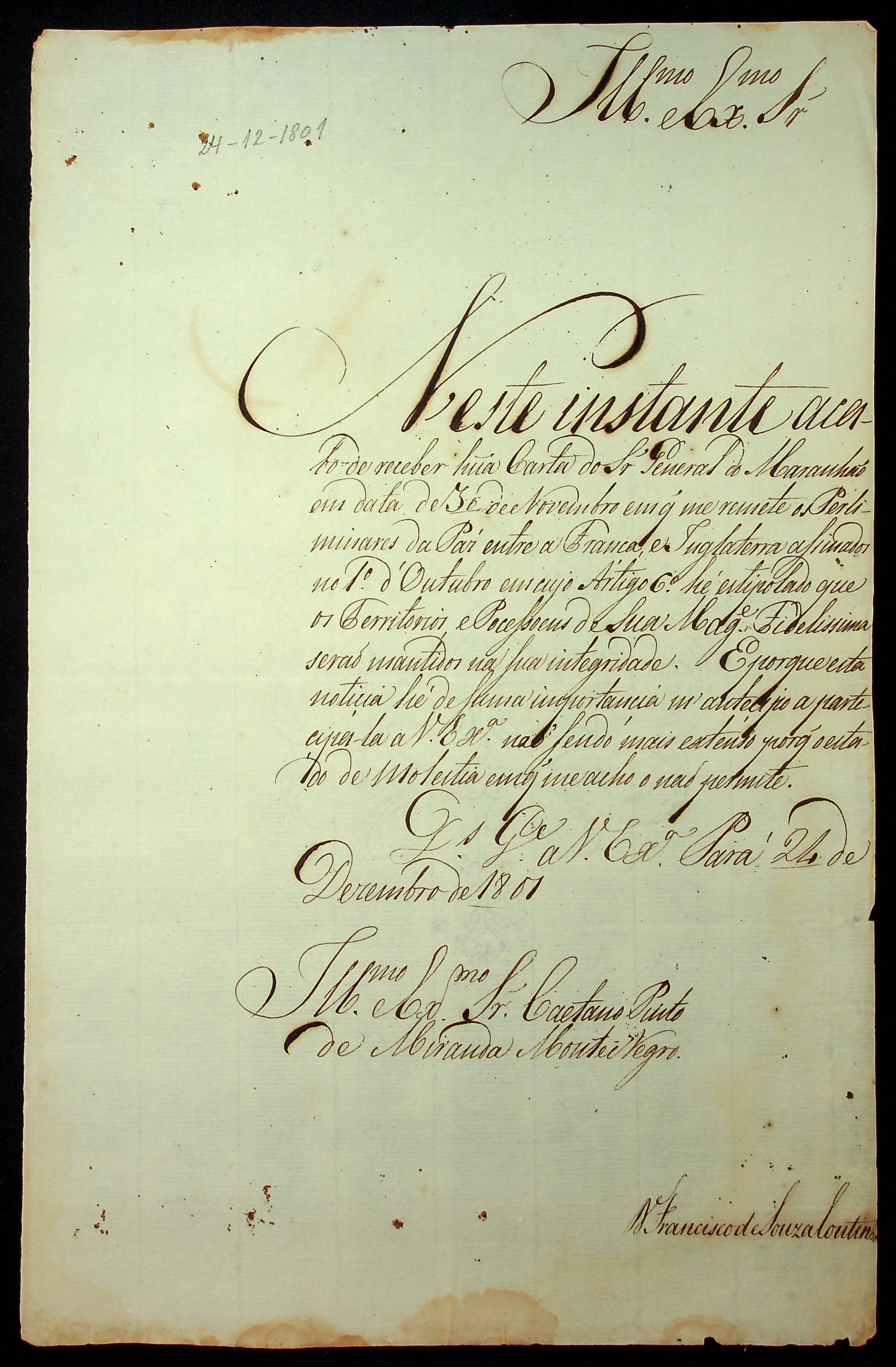 CARTA do [Governador e Capitão-General da Capitania do Grão Pará e Maranhão] Francisco de Souza Coutinho ao [Governador e Capitão General da Capitania de Mato Grosso] Caetano Pinto de Miranda Montenegro.