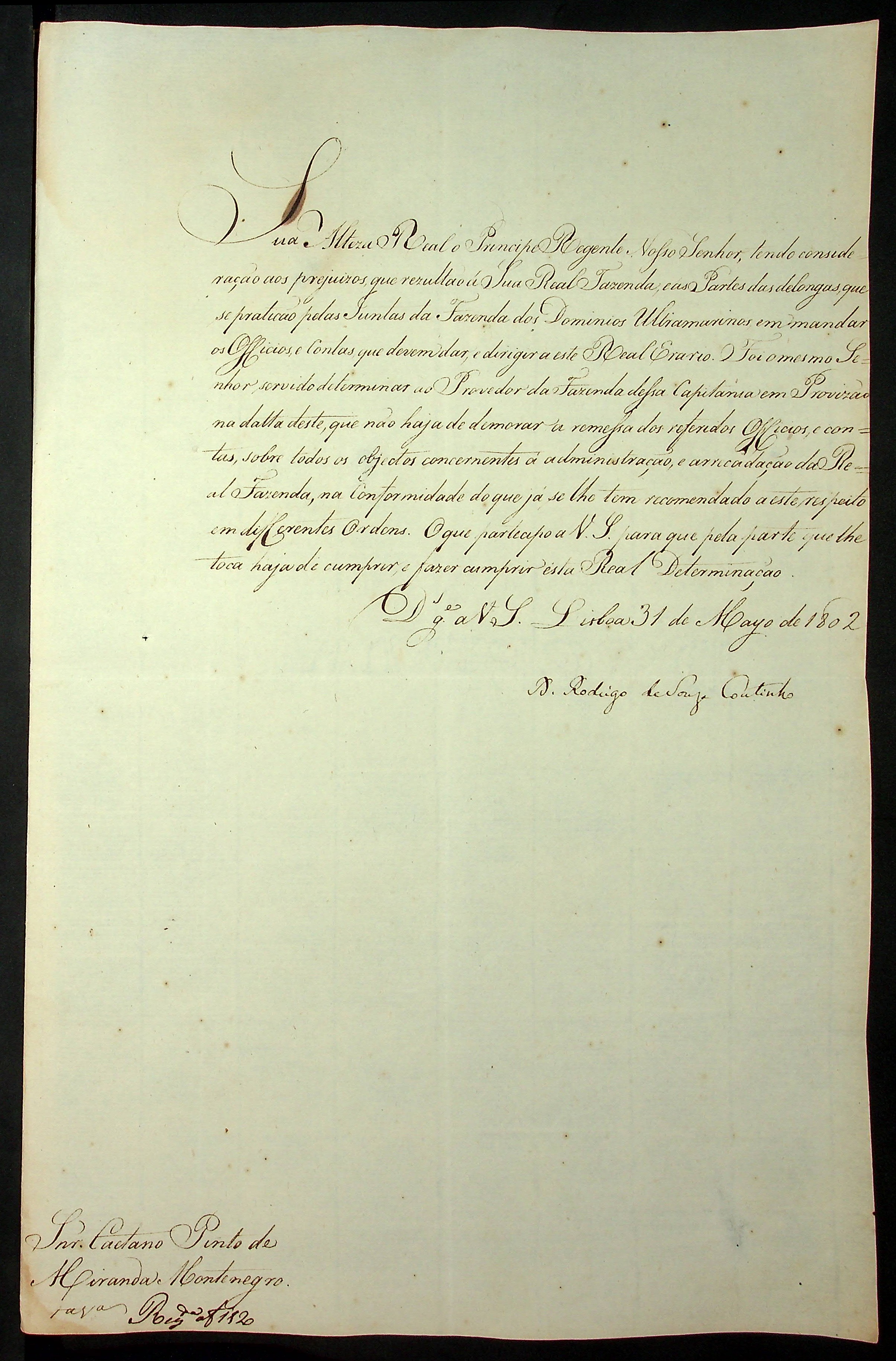 CARTA (conjunto de cópia) do Presidente do Real Erário Rodrigo de Souza Coutinho ao [Governador e Capitão General da Capitania de Mato Grosso Caetano Pinto de Miranda Montenegro].