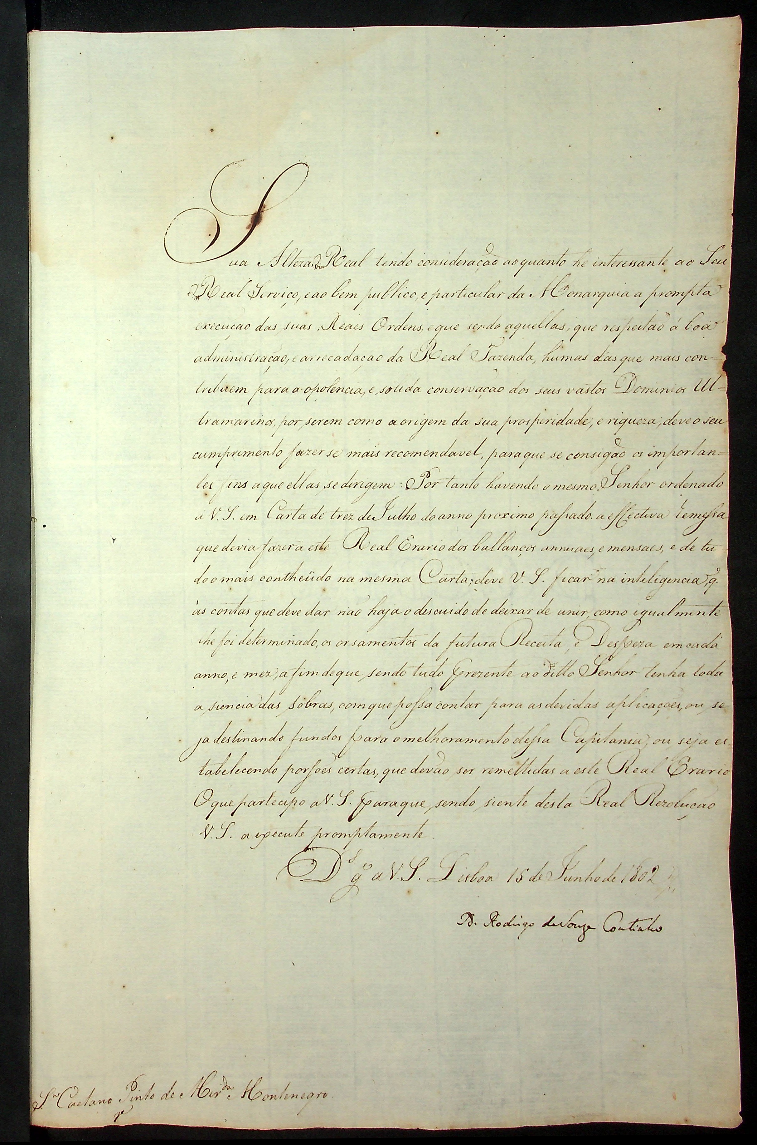 CARTA (conjunto de cópia) do Presidente do Real Erário Rodrigo de Souza Coutinho ao [Governador e Capitão General da Capitania de Mato Grosso Caetano Pinto de Miranda Montenegro].