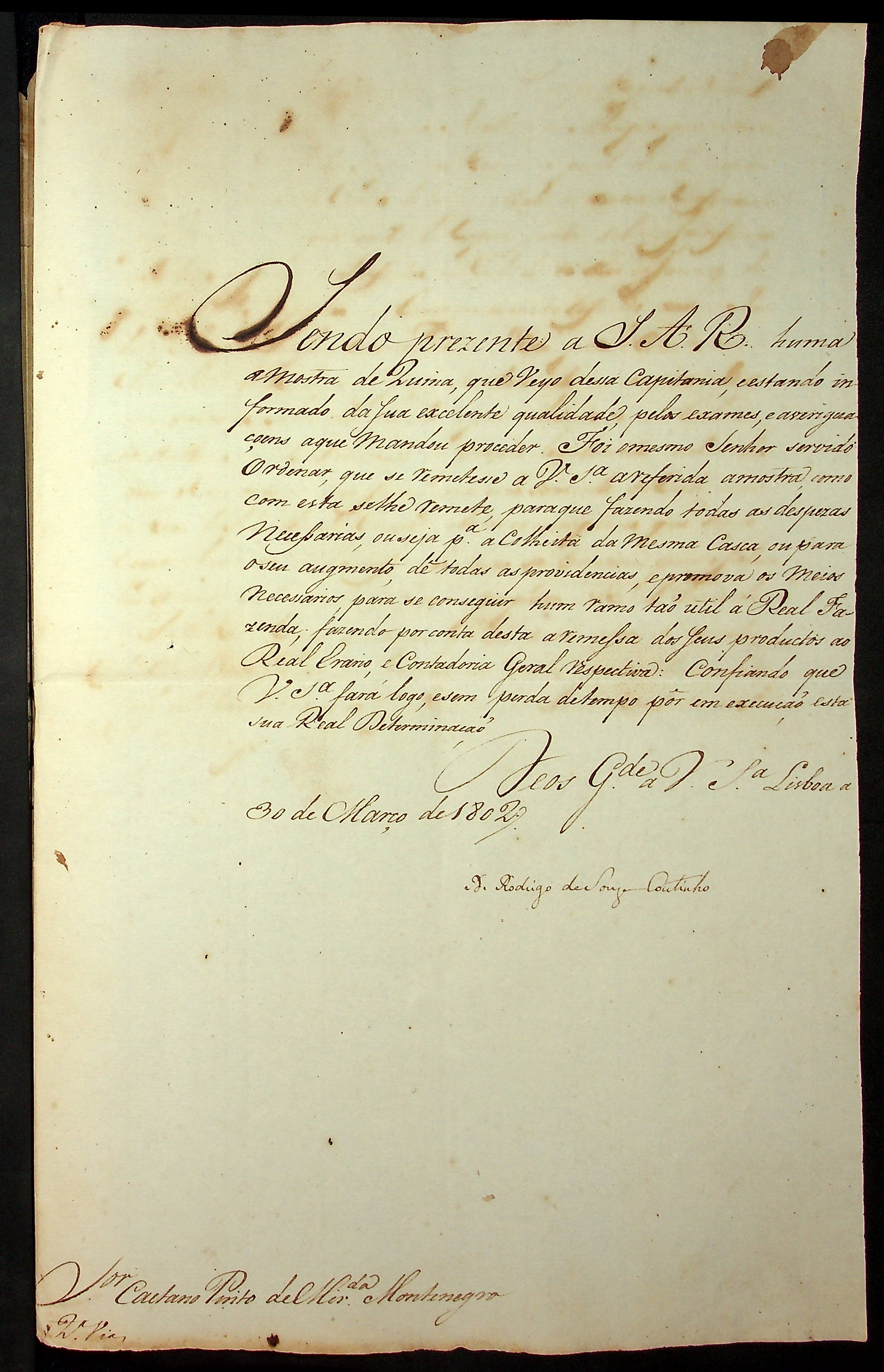 CARTA (conjunto de cópia) do Presidente do Real Erário Rodrigo de Souza Coutinho ao [Governador e Capitão General da Capitania de Mato Grosso Caetano Pinto de Miranda Montenegro].