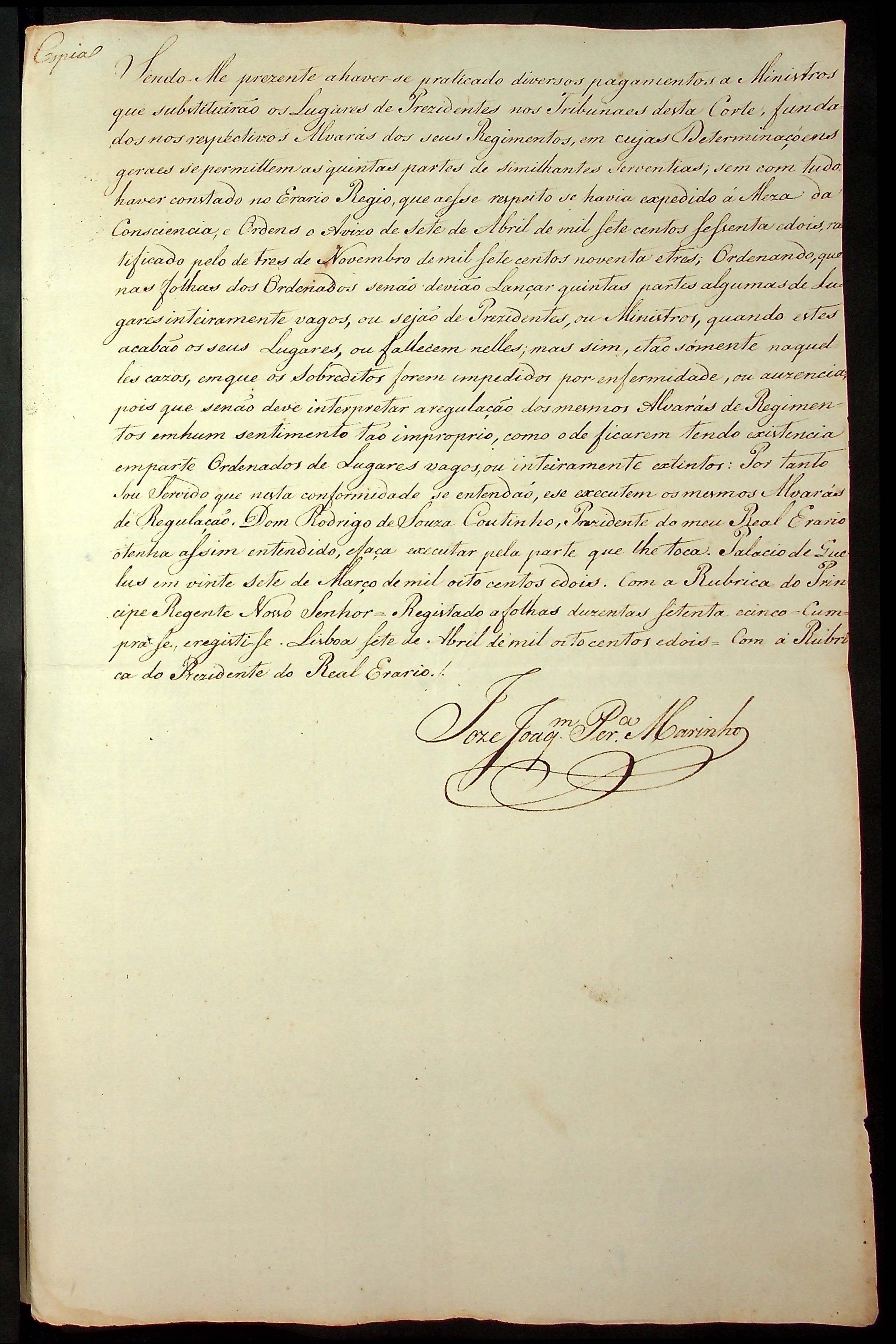 CARTA (conjunto de cópia) do Presidente do Real Erário Rodrigo de Souza Coutinho ao [Governador e Capitão General da Capitania de Mato Grosso Caetano Pinto de Miranda Montenegro].