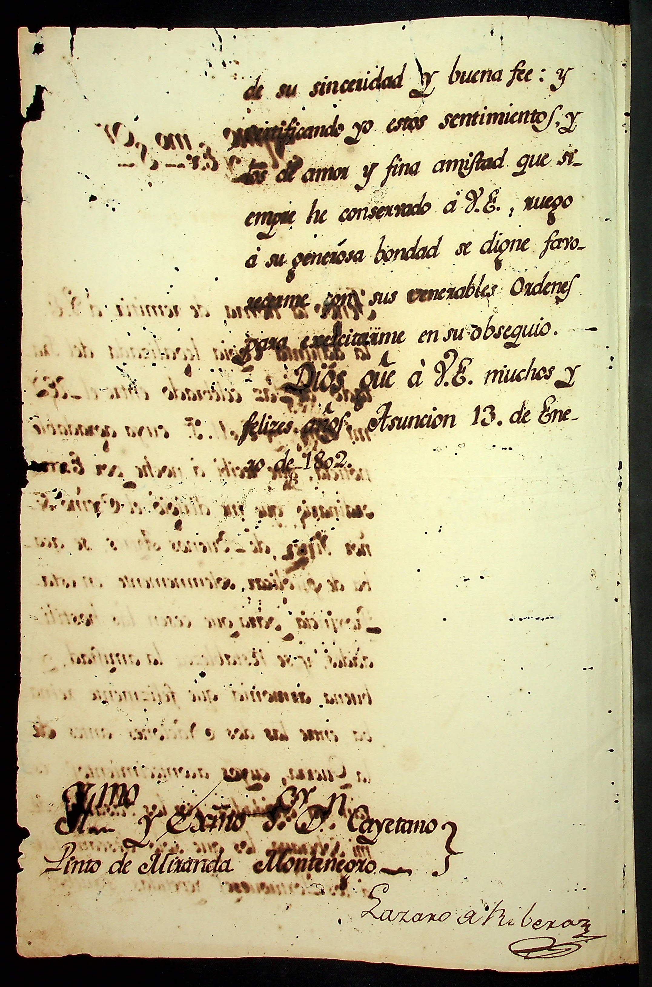 CARTA do [Governador da Província do Paraguai] Lazaro de Ribera ao [Governador e Capitão General da Capitania de Mato Grosso] Caetano Pinto de Miranda Montenegro.