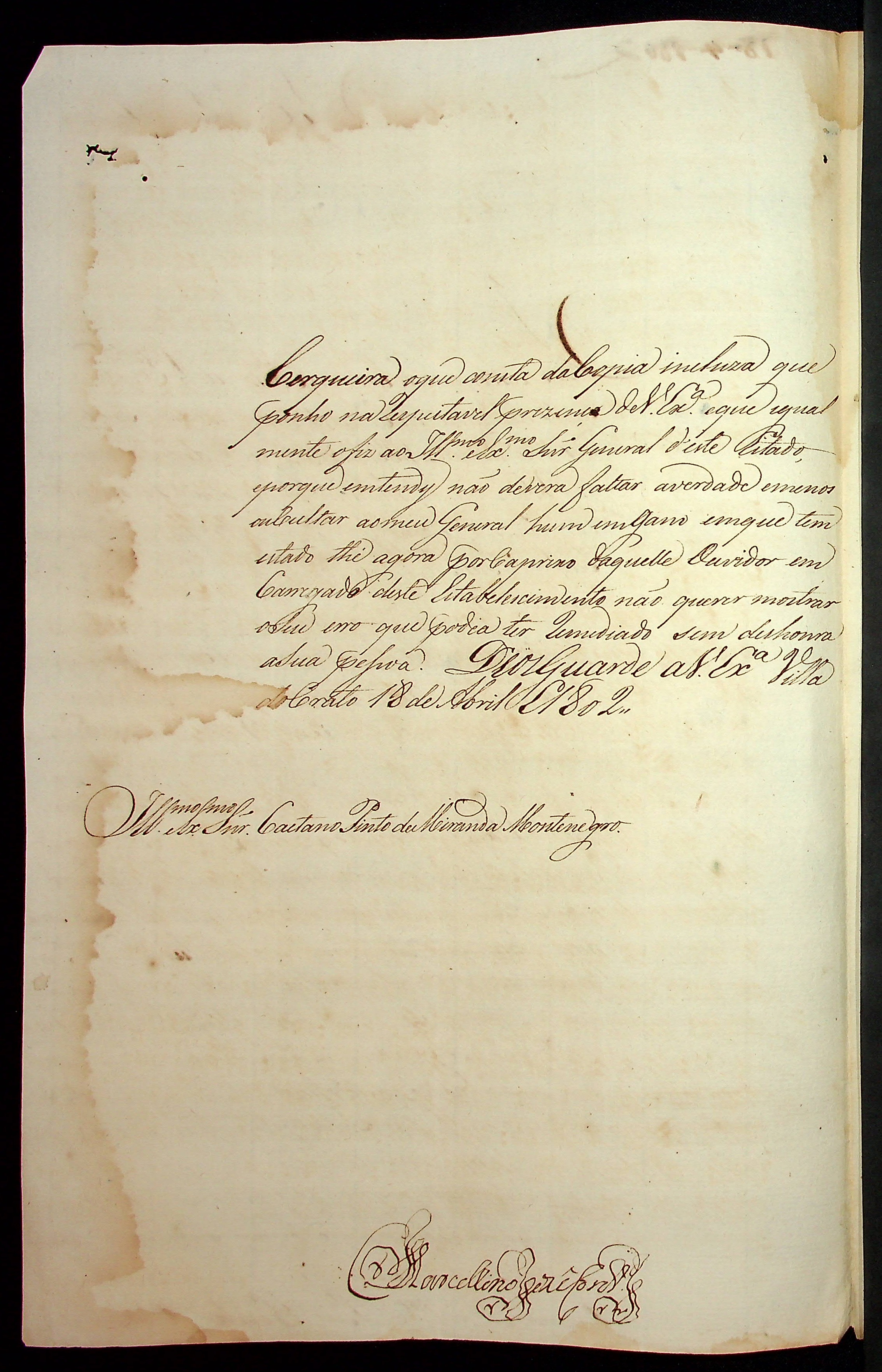 CARTA do [Comandante do Destacamento da Vila de São José do Crato] Marcelino José Cordeiro ao [Governador e Capitão General da Capitania de Mato Grosso] Caetano Pinto de Miranda Montenegro.