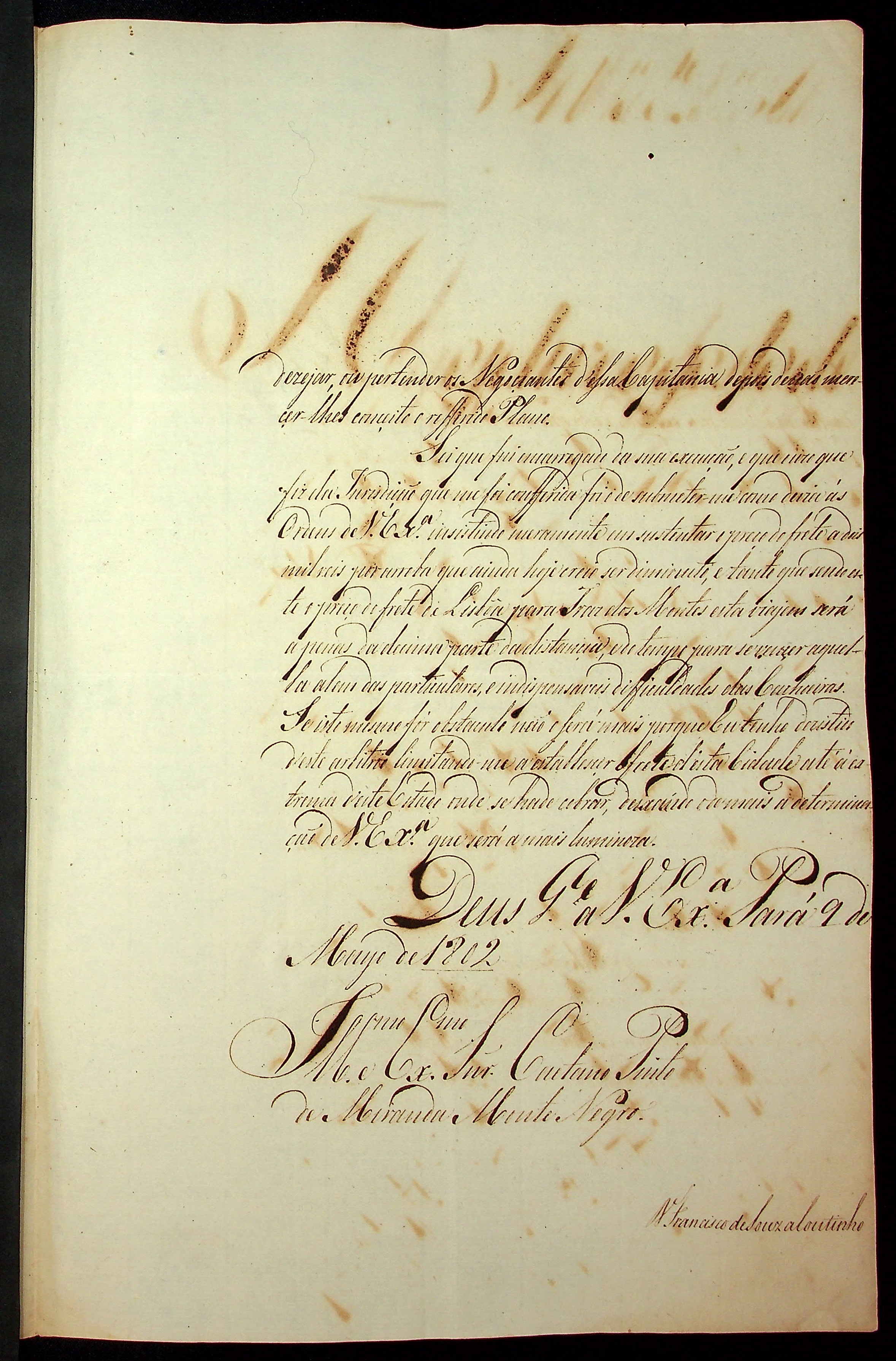 CARTA do [Governador e Capitão-General da Capitania do Grão Pará e Maranhão] Francisco de Souza Coutinho ao [Governador e Capitão General da Capitania de Mato Grosso] Caetano Pinto de Miranda Montenegro.